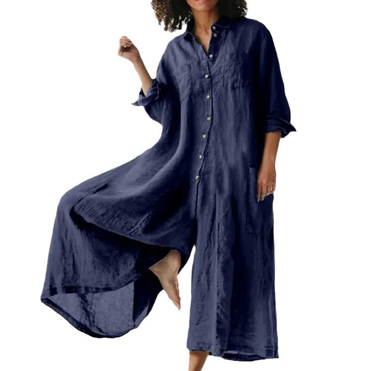 Wal-Mart трансграничный Amazon европейский и американский однотонный повседневный комбинезон с длинными рукавами средней длины из хлопка и льна с рубашкой для женщин