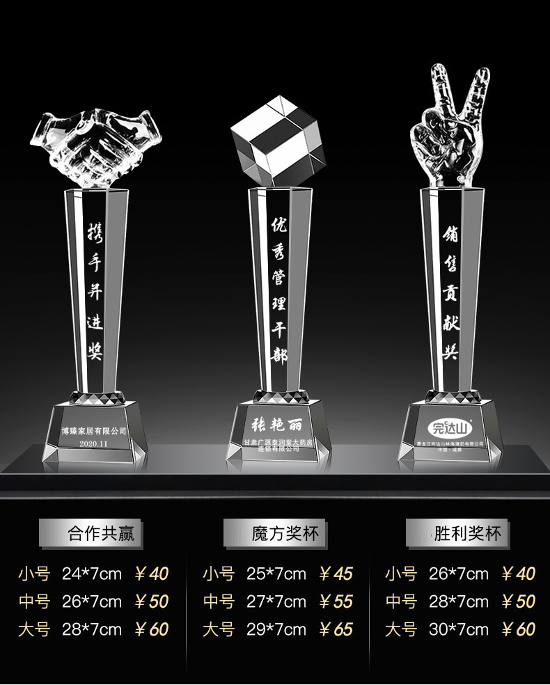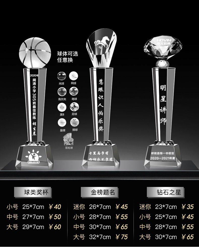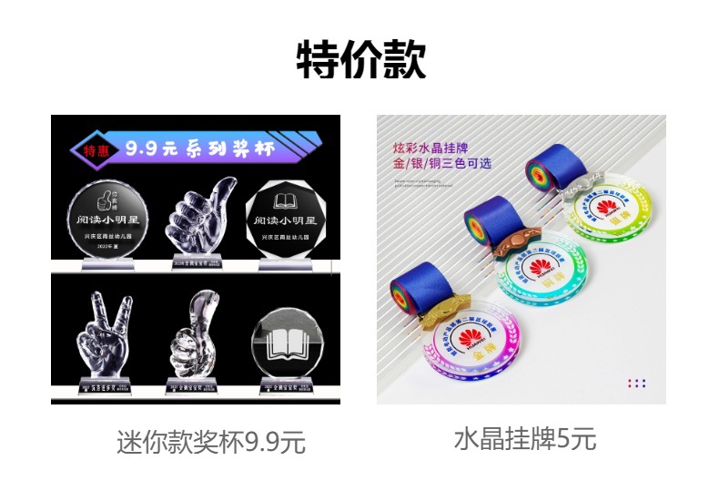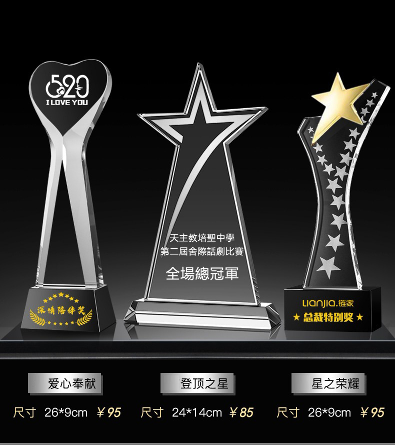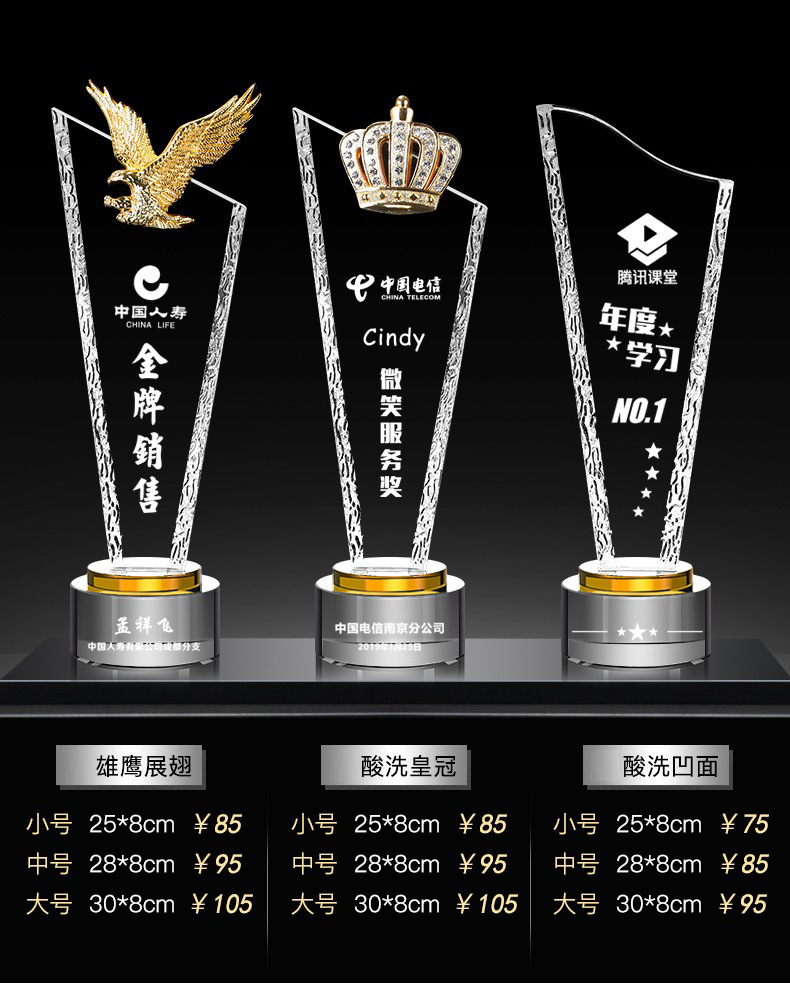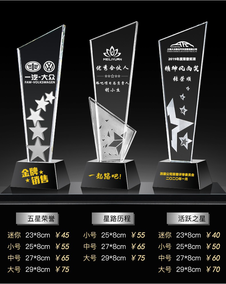 Специальное предложение медаль; Специальное предложение в мини-стиле; Мини-стиль; Хрустальный трофей (пожалуйста, обратитесь в службу поддержки для уточнения конкретных стилей); Обычный хрустальный трофей; Цветной Печатный хрустальный трофей; Деревянный трофей; Смола Трофи