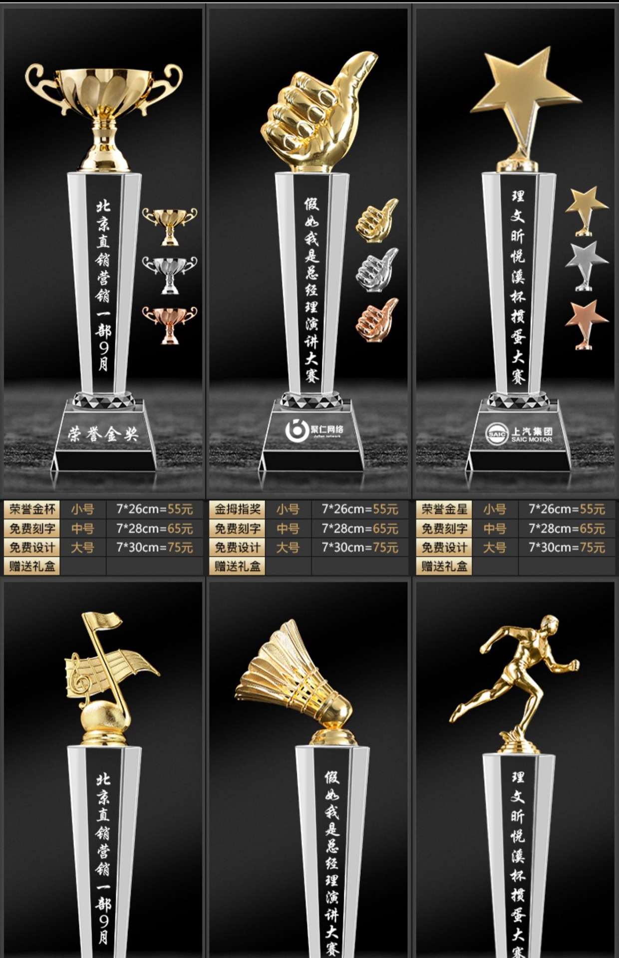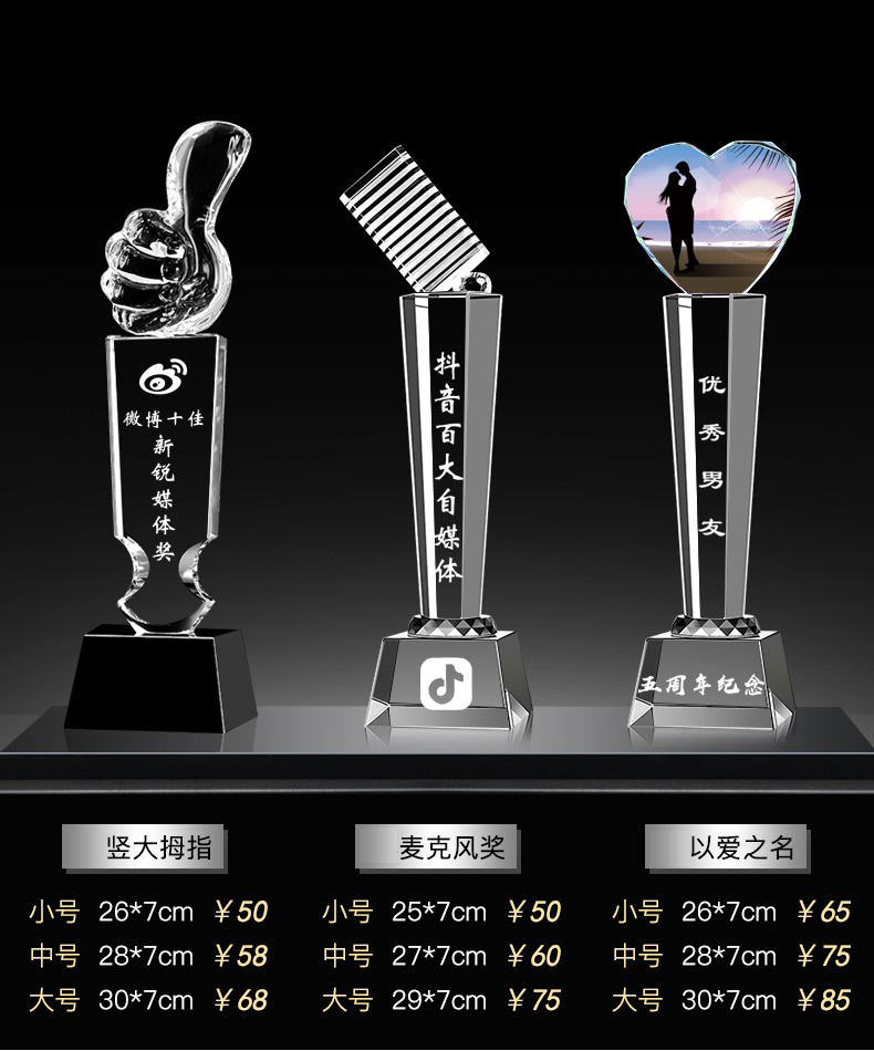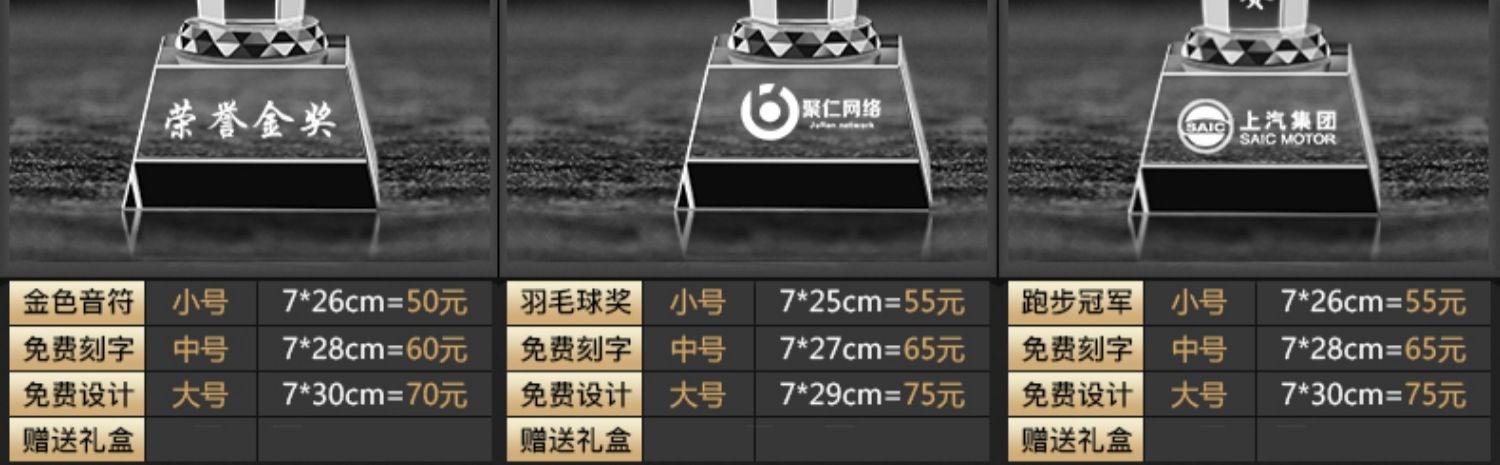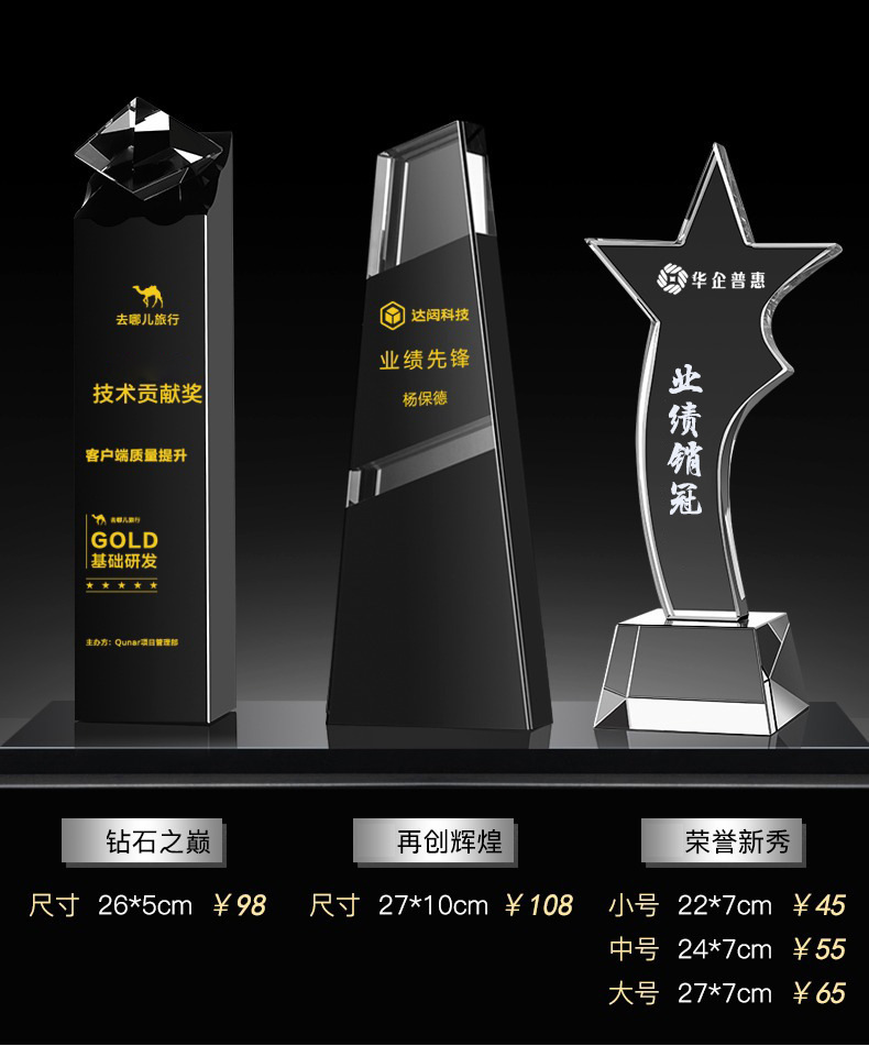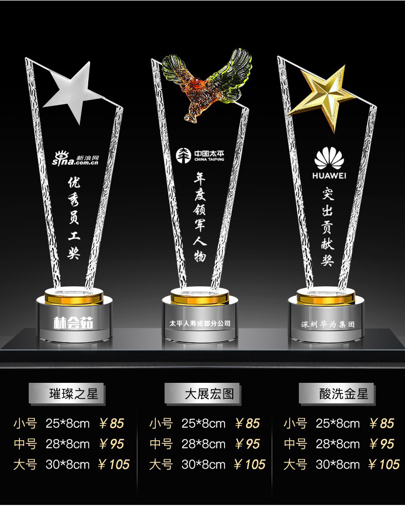 Специальное предложение медаль; Специальное предложение в мини-стиле; Мини-стиль; Хрустальный трофей (пожалуйста, обратитесь в службу поддержки для уточнения конкретных стилей); Обычный хрустальный трофей; Цветной Печатный хрустальный трофей; Деревянный трофей; Смола Трофи