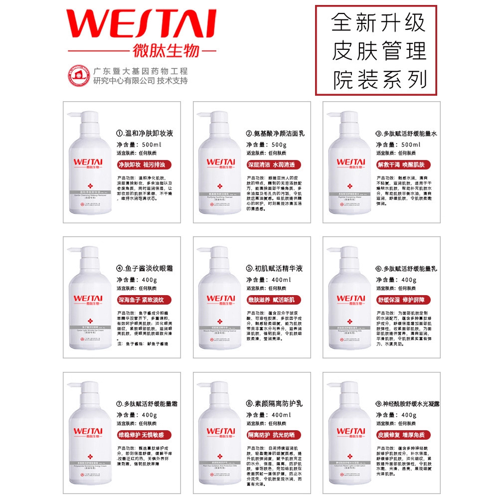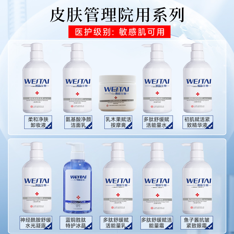 Аминокислотное очищающее молочко [500 г/флакон]; Эссенция для восстановления кожи First Skin [400 мл/флакон]; Полипептидная восстанавливающая энергетическая вода [500 мл/бутылка]; Полипептидный восстанавливающий и успокаивающий энергетический лосьон [400 мл/флакон]; Полипептидный восстанавливающий и успокаивающий энергетический крем [400 г/флакон]; Успокаивающий увлажняющий гель с керамидами [400 г/флакон]; Лосьон для защиты кожи без макияжа [400 г/флакон]; Нежный очищающий салфеточный раствор для снятия макияжа [500 г/флакон]; Крем для глаз против морщин с икрой [400 г/флакон]; Восстанавливающий массажный крем с маслом ши [500 г/флакон]; Специальный уход с голубым медным пептидом и кристаллами льда [400 г/флакон]