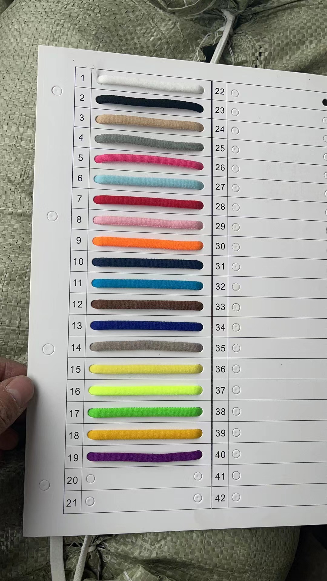 № 1 цвет белый; Цвет № 2 черный; № 3 цвет хаки; 4 цвет серый; 5 цвет розового красного; № 6 цвет небесно-голубой; № 7 красный; № 8 розовый; № 9 ярко-оранжевый; 10 цвет (темно-синий); 11 цвет (озеро голубое); № 12 коричневый; 13-й цвет королевский синий; 14 цвет; 15 цвет желтый; № 16 флуоресцентный желтый; 17 цвет (трава зеленая); 18 цвет; № 19 фиолетовый; Цветная карта