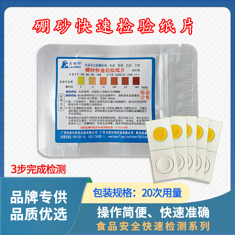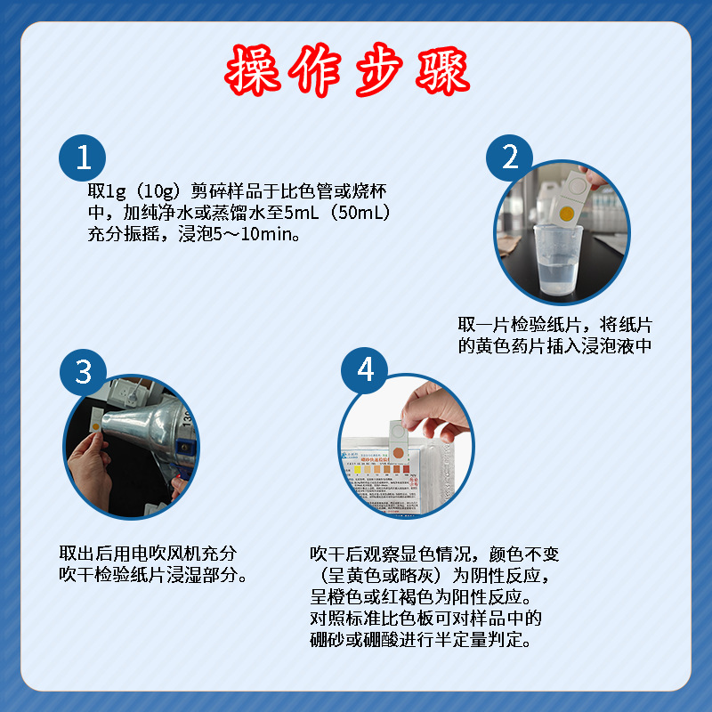 Тест-полоски для определения борной кислоты в пищевых продуктах, таких как фрикадельки, мясные начинки, выпечка, рисовые пирожки и т.д., а также для быстрого тестирования на содержание борной кислоты.