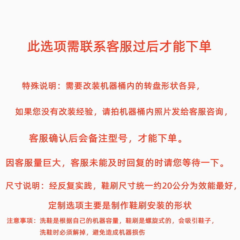 Спиральная обувная щетка (твердый шелк); Спиральная щетка для обуви (жесткая проволока) + специальная длинная отвертка для тапочек, сандалий; Спиральная обувная щетка (гибкая) более широкий диапазон; Спиральная щетка для обуви (гибкая) + удлиненная отвертка для стирки обуви; Пользовательская щетка для обуви (см. Инструкции)