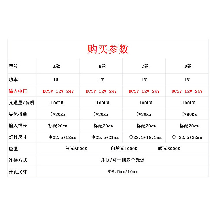 Тип А 3 В; Тип А 3,7 В; Тип А 5 В; Тип А 12 В; Тип А 24 В; Тип Б 3В; Тип Б 3,7 В; Тип Б 5 В; Тип Б 12 В; Тип Б 24 В; Тип С 3В; Тип С 3,7 В; Тип С 5 В; Тип С 12 В; Тип С 24 В; Тип D 3В; Тип Д 3,7 В; Тип D 5 В; Тип D 12 В; Тип D 24 В