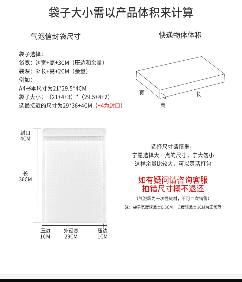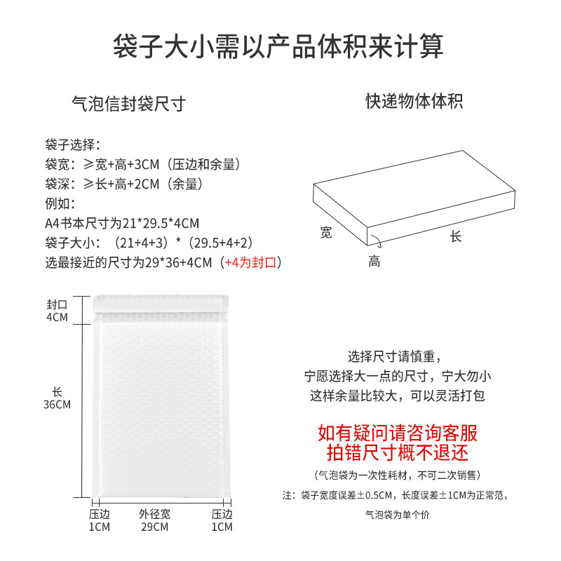 产品尺寸为外径尺寸,如11*11+4cm,实际为外径宽*袋长+封口长度,减去压边等实际可用尺寸约为9*11+4cm左右,因袋子批量生产,尺寸会有±0.5cm左右的误差,介意者勿拍!