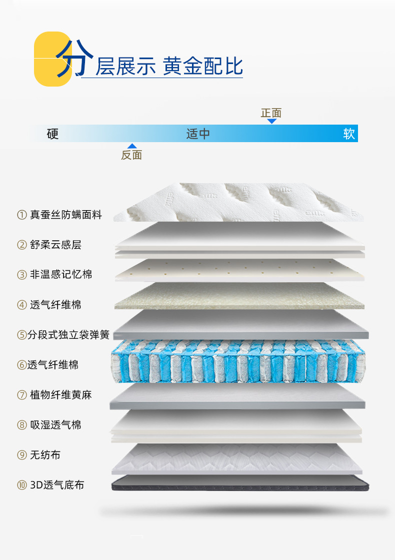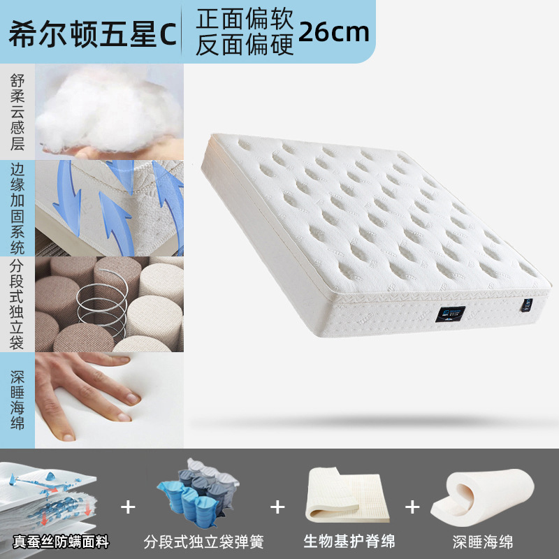 Жесткий матрас: пена для глубокого сна + прохладная ткань, независимые пружины + шелковая ткань; Пена средней жесткости с биоосновой для поддержки позвоночника + пена для глубокого сна + независимые пружины из прохладной ткани + шелковая ткань; Лицевая сторона: Мягкая; Задняя сторона: Жесткая. Оснащен био-пеной для поддержки позвоночника, дышащей волокнистой пеной, пружинами Coolmax и обивкой из шелковой ткани.; Поддержка нулевой гравитации, жесткая обратная сторона, пена с эффектом памяти + пена для глубокого сна + прохладная ткань, независимые пружины + шелковая ткань; Комфорт в невесомости: 5 см пены с эффектом памяти + био-пена для поддержки позвоночника + охлаждающая ткань, независимые пружины + пена для глубокого сна + шелковая ткань; Тысячи отелей и пансионов по всей стране, добро пожаловать на фабрику для руководства