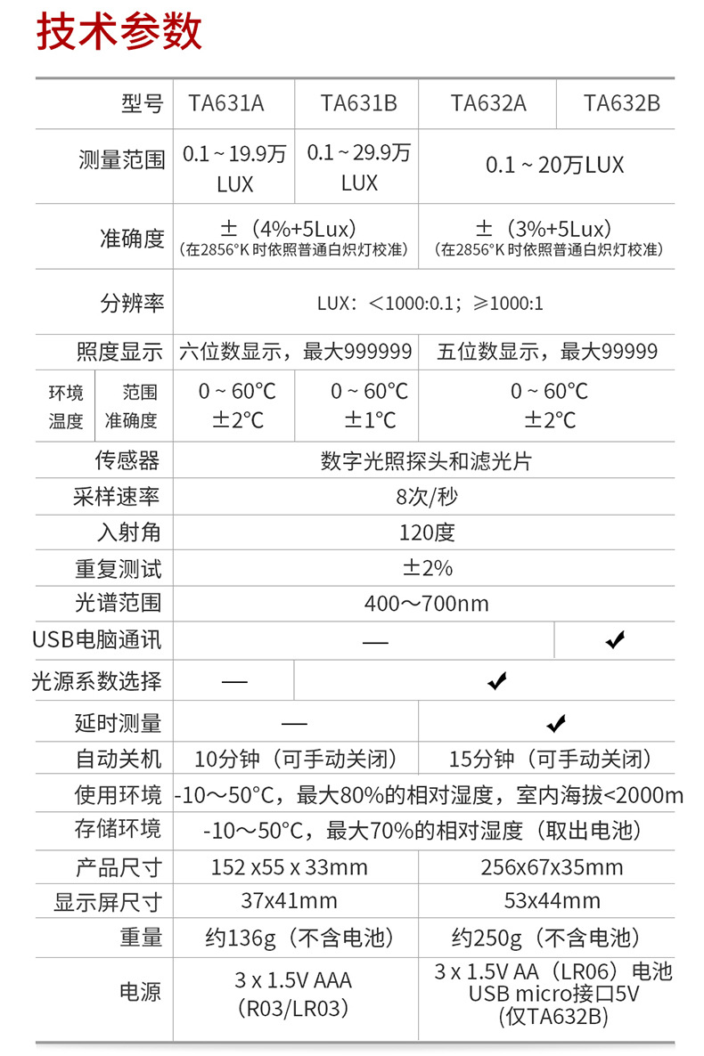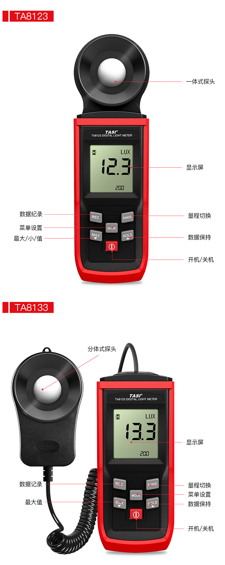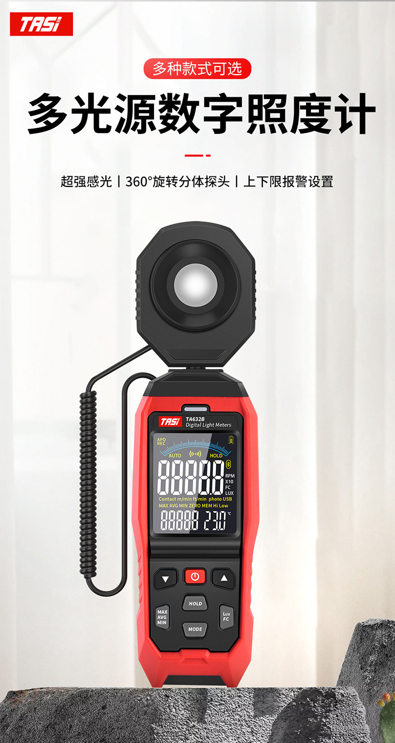Модель продвижения продукта 636A (диапазон 200k LUX); 630A «все в одном» (диапазон 200k LUX); 630B раздельного типа (диапазон 200 000 ЛЮКС); 8123 интегрированный (диапазон 200 000 LUX); 8133 раздельного типа (диапазон 200 000 LUX); 631A бытовая модель (диапазон 200 000 LUX + отображение температуры + сигнализация); Модель с цветным экраном 632A (диапазон 200 000 люкс + дисплей температуры + сигнализация); Модель с цветным экраном 632B, USB-коммуникацией (диапазон 200 000 LUX + отображение температуры + сигнализация)