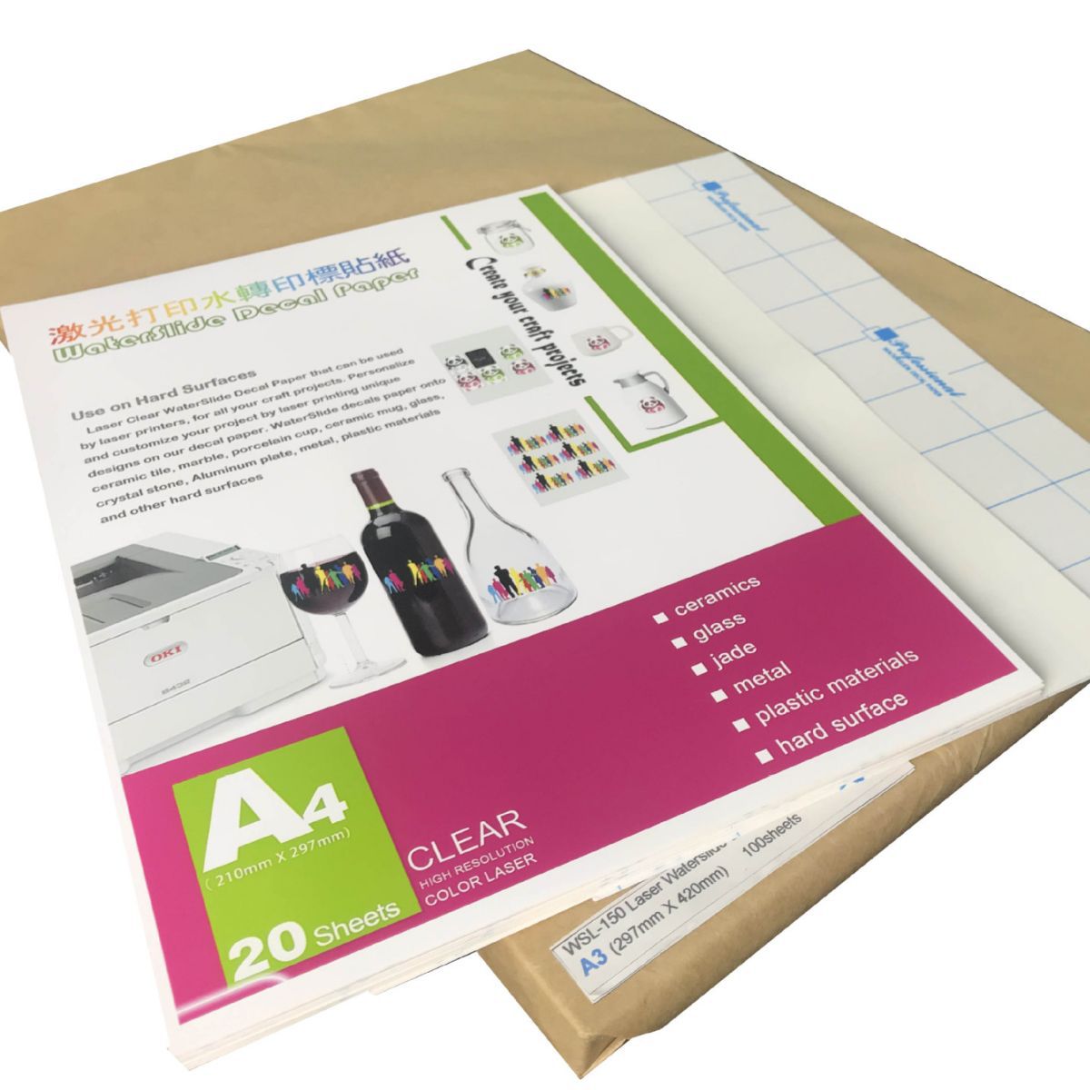 水转印标贴膜(激光打印)用于硬质工艺品上面的彩色Logo、标识、标徽等的定制。选用平进纸平出纸的彩色激光打印机或彩色激光打印复印一体机,如:OKI Data C941dn 、ES9542,Konica Minolta AccurioLabel 230,及巡边定位切割机模切组合,制作彩色的Logo、标识、标徽等,然后水滑转移到没有表面处理(没有涂层)的硬质工艺品上面。