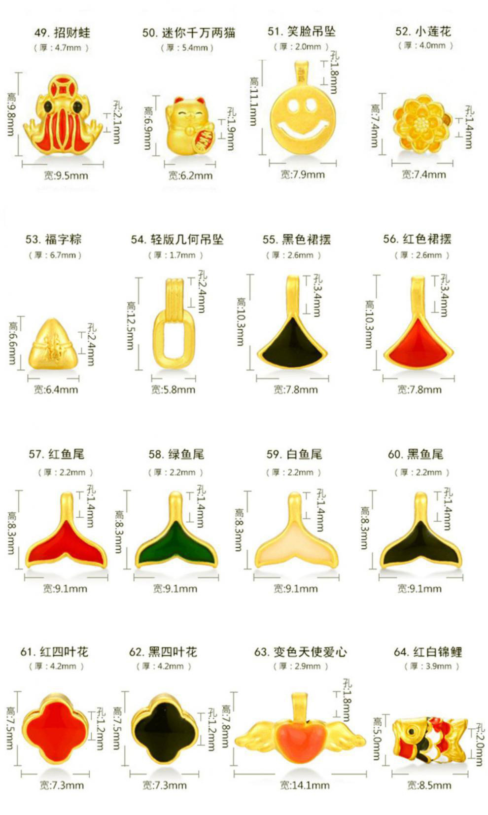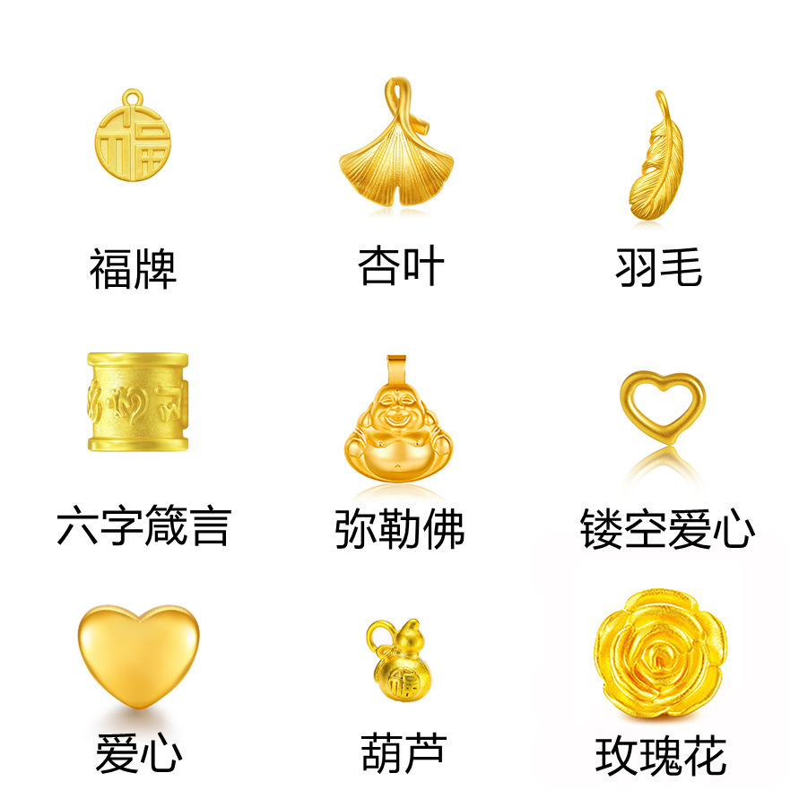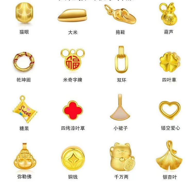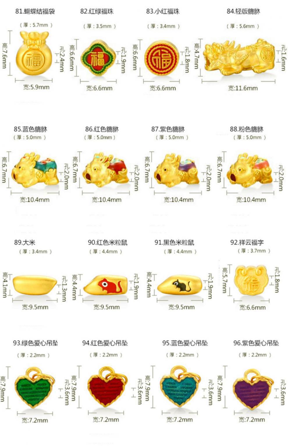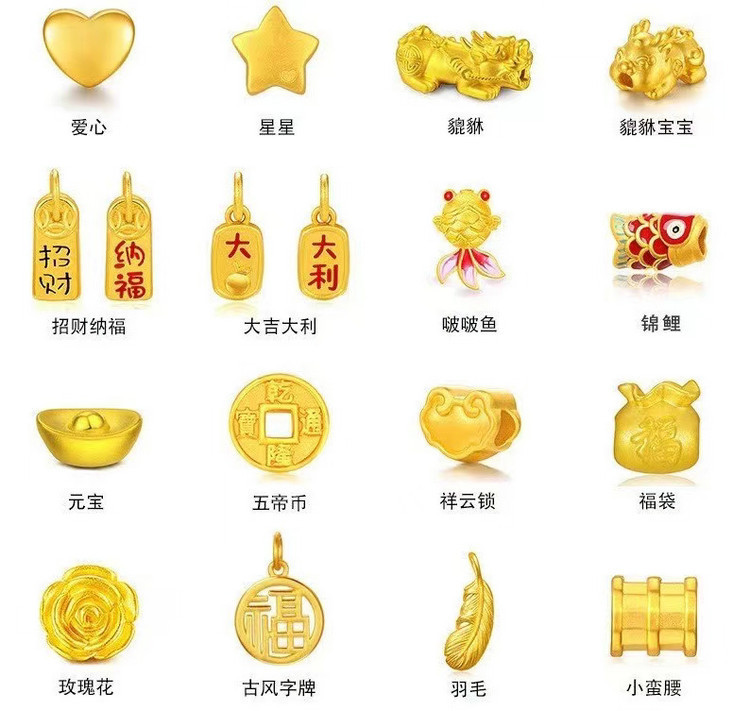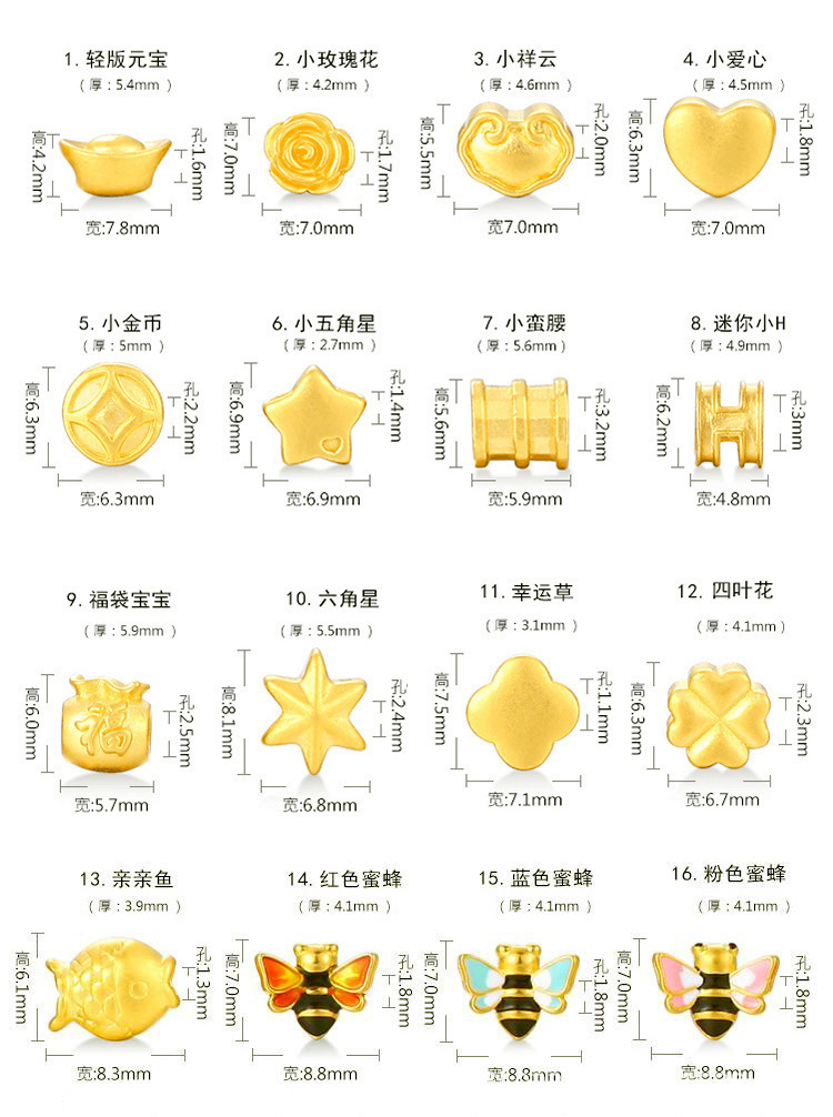 Маленькая Талия [около 0065 г]; Роза [около 0,07 г]; Листья абрикоса [около 0075 г]; Перо [около 0075 г]; Полая любовь [около 0075 г]; Четырехлистный клевер [около 0,085 г]; Подсолнух [около 0,08 г]; Сумка на удачу [около 0,08 г]; Любовь [около 0,08 г]; Юаньбао [около 0,08 г]; Рыба БОБО [около 0,08 г]; Геометрическое кольцо [около 0,08 г]; Фу Пай [около 0,085]; Роза [около 0,1 г]; Шестисимвольное девиз [около 0,1 г]; Сянюнь [около 0,1 г]; Малыш Храбрый [около 0,1 г]; Подсолнечник [около 0,1 г]; Счёты [около 0,1 г]; Глянцевая акация [около 0,11 г]; Песчаная поверхность, бобы акации [около 0,11 г]; Браслет лотоса [около 0,16 г]; Подвеска в форме лотоса [около 0,18 г]; Нанесено с символикой удачи [около 0,21 г]; Окрашено для привлечения богатства и благословения [около 0,21 г]; Нагрязь внезапно золотой кирпич [около 0,2 г]