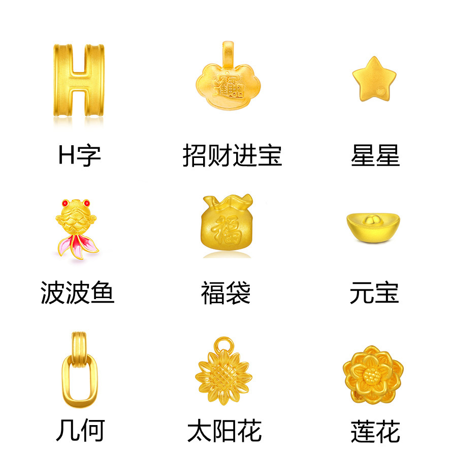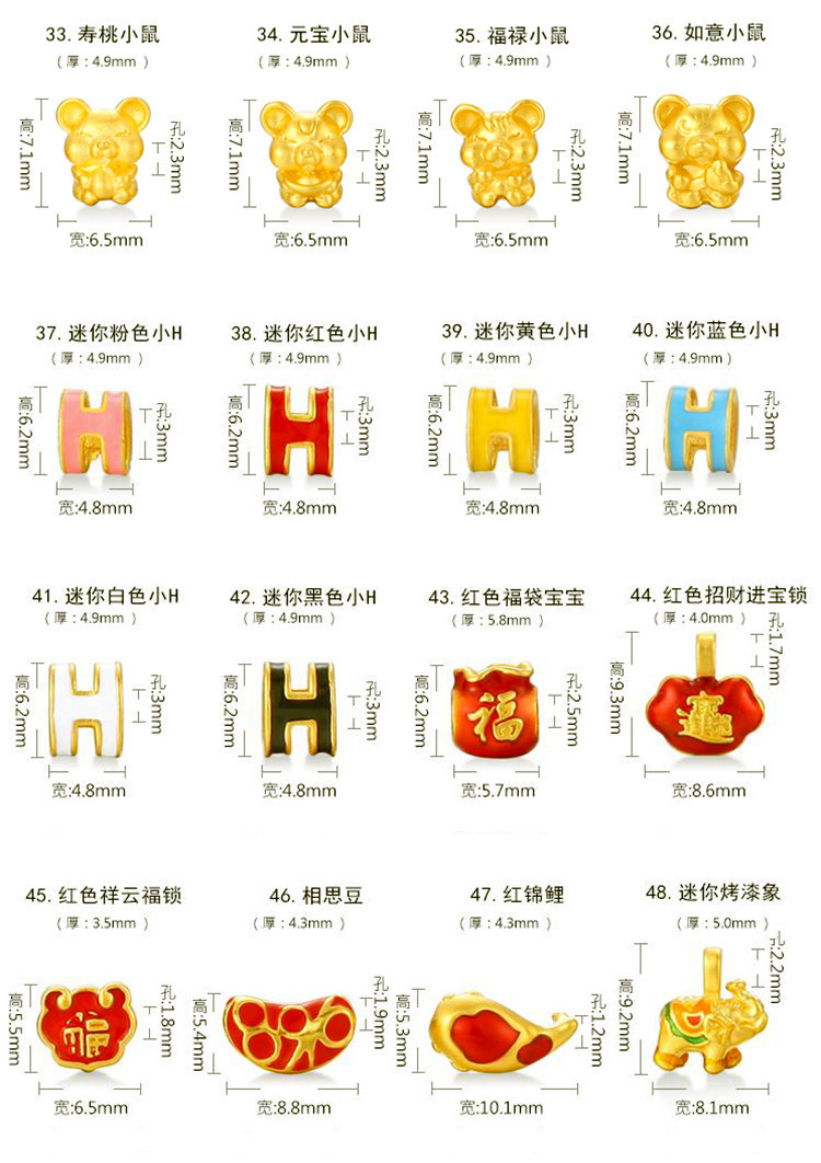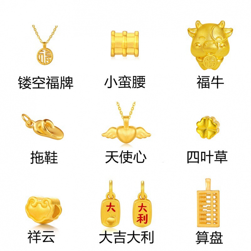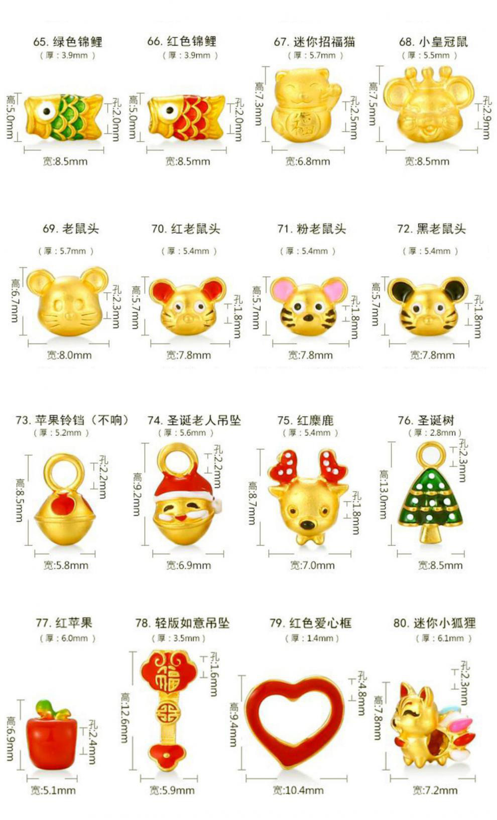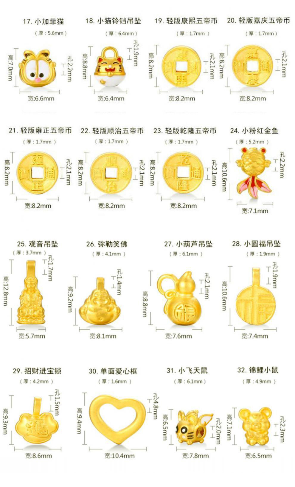 Маленькая Талия [около 0065 г]; Роза [около 0,07 г]; Листья абрикоса [около 0075 г]; Перо [около 0075 г]; Полая любовь [около 0075 г]; Четырехлистный клевер [около 0,085 г]; Подсолнух [около 0,08 г]; Сумка на удачу [около 0,08 г]; Любовь [около 0,08 г]; Юаньбао [около 0,08 г]; Рыба БОБО [около 0,08 г]; Геометрическое кольцо [около 0,08 г]; Фу Пай [около 0,085]; Роза [около 0,1 г]; Шестисимвольное девиз [около 0,1 г]; Сянюнь [около 0,1 г]; Малыш Храбрый [около 0,1 г]; Подсолнечник [около 0,1 г]; Счёты [около 0,1 г]; Глянцевая акация [около 0,11 г]; Песчаная поверхность, бобы акации [около 0,11 г]; Браслет лотоса [около 0,16 г]; Подвеска в форме лотоса [около 0,18 г]; Нанесено с символикой удачи [около 0,21 г]; Окрашено для привлечения богатства и благословения [около 0,21 г]; Нагрязь внезапно золотой кирпич [около 0,2 г]