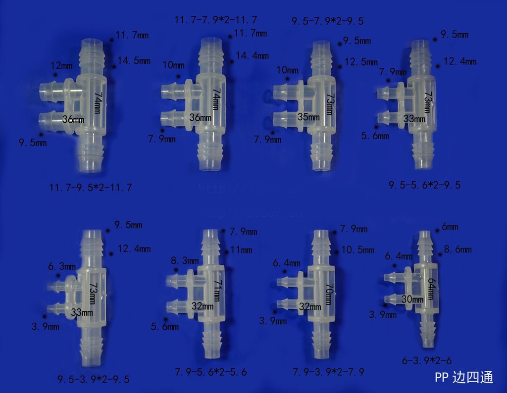 2,4 мм, четырехходовой, одинакового диаметра; 3,9 мм, четырехходовой, одинакового диаметра; 4,8 мм, боковые, четырехсторонние, одинакового диаметра; 5,6 мм, боковой четырехходовой, одинакового диаметра; 6,4 мм, боковые, четырехсторонние, одинакового диаметра; 7,9 мм, равнодиаметрный, четырехходовой; 6-3,9*2-6 кромка переменного диаметра, четырехсторонняя; 7,9-3,9*2-7,9 уменьшенный край, четырехсторонний; 7,9-5,6*2-7,9 переменного диаметра, боковой, четырехходовой; 9,5-3,9*2-3,9 переменного диаметра, боковой четырехходовой; 9,5-5,6*2-9,5 переменного диаметра, боковой четырехходовой; 9,5-7,9*2-9,5 кромка переменного диаметра, четырехсторонняя; 11,7-7,9*2-7-11,7 кромка переменного диаметра, четырехсторонняя; 11,7-9,5*2-11,7 переменного диаметра, боковой четырехходовой