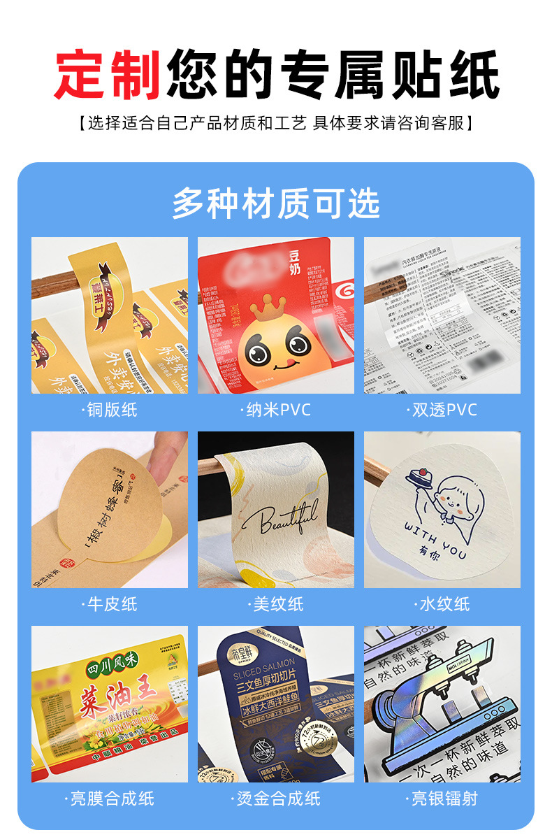 [Медная бумага | Высококачественная печать | Высокая экономичность]; [Пластиковый лист | Антикоррозийный и устойчивый к царапинам | Маслостойкий и сверхлипкий]; [Двойной прозрачный ПВХ | Высокая степень прозрачности и четкости | Водонепроницаемость для холодильного оборудования]; [Текстурированная бумага丨Шероховатая текстура丨Простое искусство]; [Нано ПВХ | Прозрачная текстура | Изысканность и утонченность]; [Яркий серебристый лазер | Ослепительные цвета | Четкая текстура]; [Синтетическая бумага с горячим тиснением丨Металлическая текстура丨Устойчивость к царапинам и разрывам]; [Синтетическая бумага с ярким покрытием | Четкая печать | Водонепроницаемость и устойчивость к царапинам]; Настроенный в соответствии с потребностями клиента