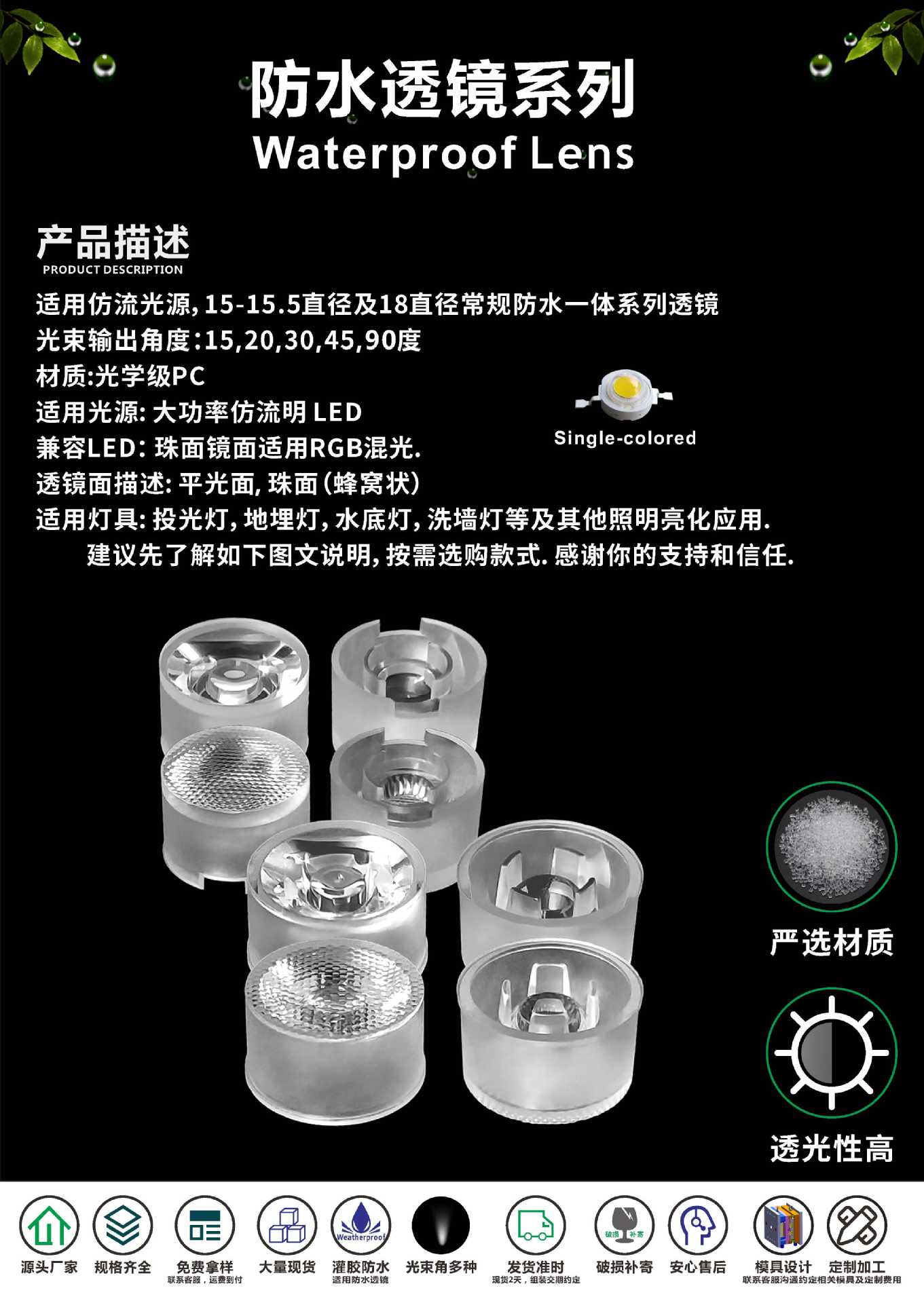 ML-15.5-20 ПК с плоскими водонепроницаемыми линзами; ML-15-45 Плоский водонепроницаемый объектив ПК; Сферическая водонепроницаемая линза ML-15-90 ПК; ML-18-15 плоский водонепроницаемый объектив ПК; ML-18-30 водонепроницаемые линзы из бисера ПК