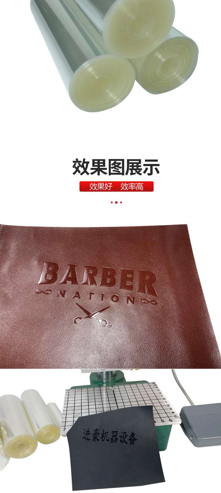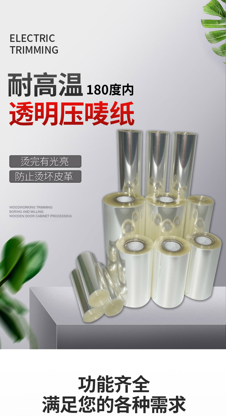 压唛纸,透明薄膜有耐高温功能称之为压唛胶纸, 防止高温烫伤烫坏产品 ,使用时胶纸平放在产品的表面,再用机器压能有效的阻止高温对产品的烫伤!受温度温是180度,皮革烫出来的效果光亮!宽度分别有 5厘米 , 10厘米 ,15厘米,25厘米,30厘米,40厘米