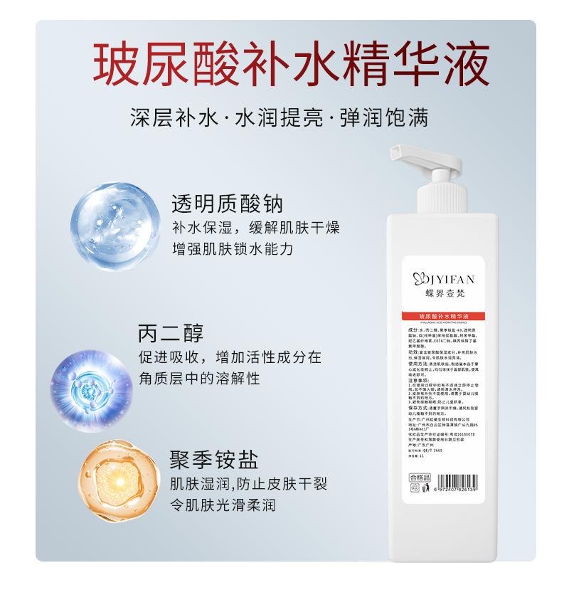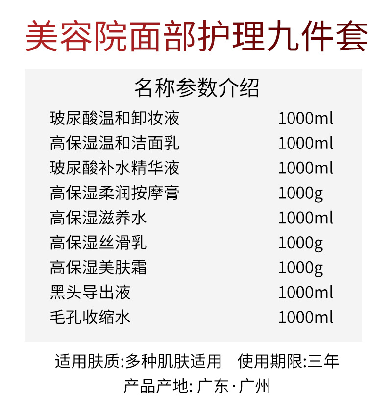 1000 мл жидкости для слива угрей; 1000 мл поры термоусадочная вода; 1000 мл питательной воды высокого увлажнения; Эссенция гиалуроновой кислоты 1000 мл; 1000 мл Шелкового Скользкого лосьона; 1000 г крем для кожи; 1000 г очищающее средство; 1000 г мягкий массажный крем; Мягкое средство для снятия макияжа с гиалуроновой кислотой 1000 мл