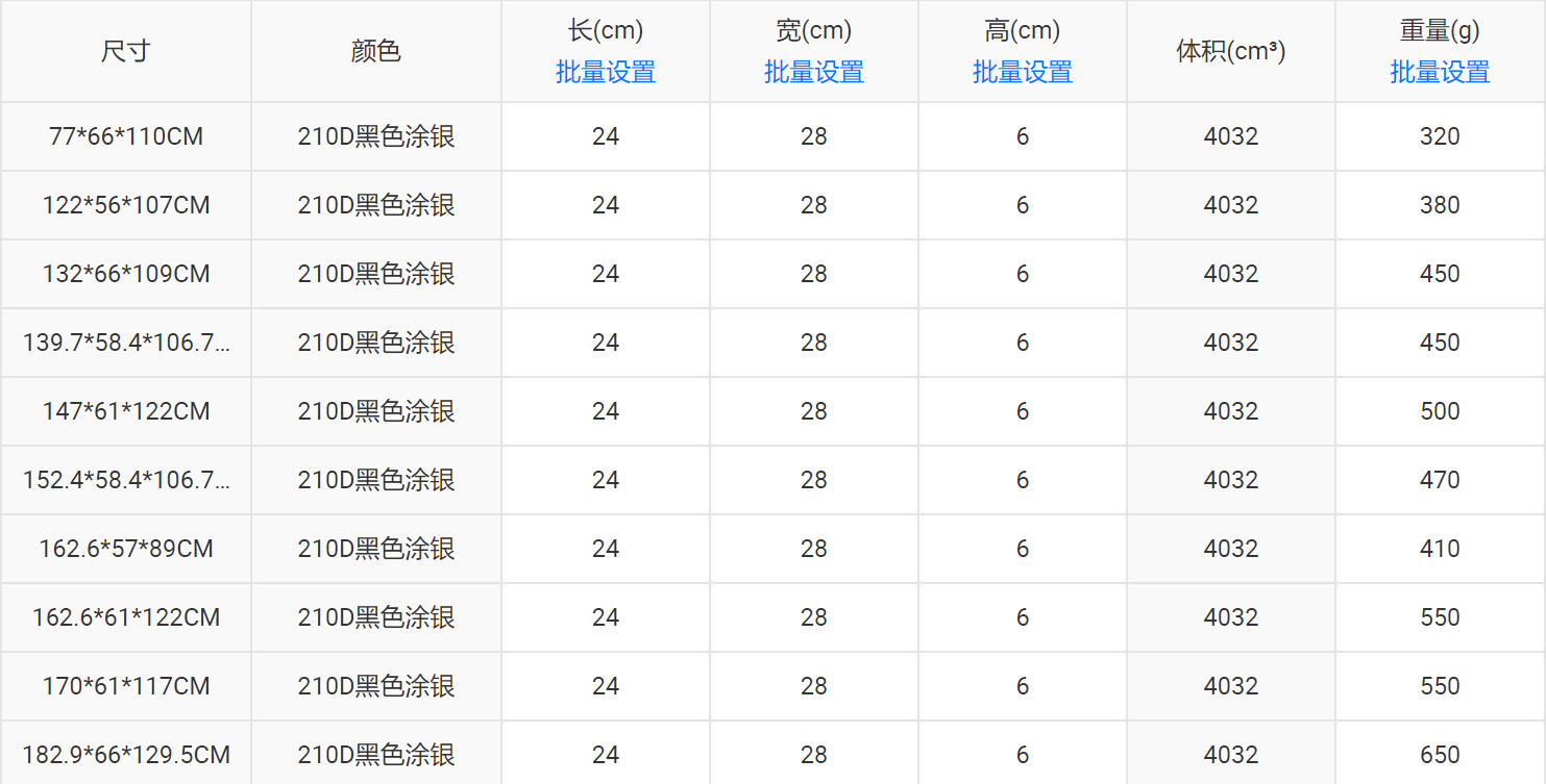 77*66*110CM; 122*56*107CM; 132*66*109CM; 139.7*58.4*106.7CM; 147*61*122CM; 152.4*58.4*106.7CM; 162.6*57*89CM; 162.6*61*122CM; 170*61*117CM; 182.9*66*129.5CM; Аксессуары: липучки с обеих сторон + 2 сумки + 1 дышащее отверстие (18*18 см).