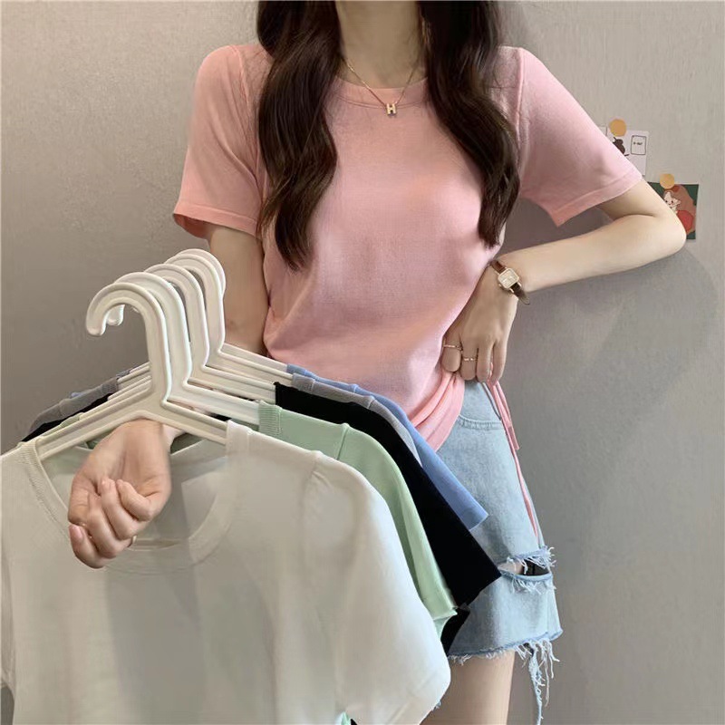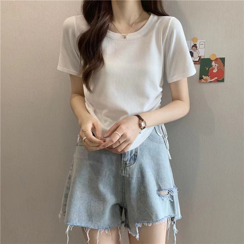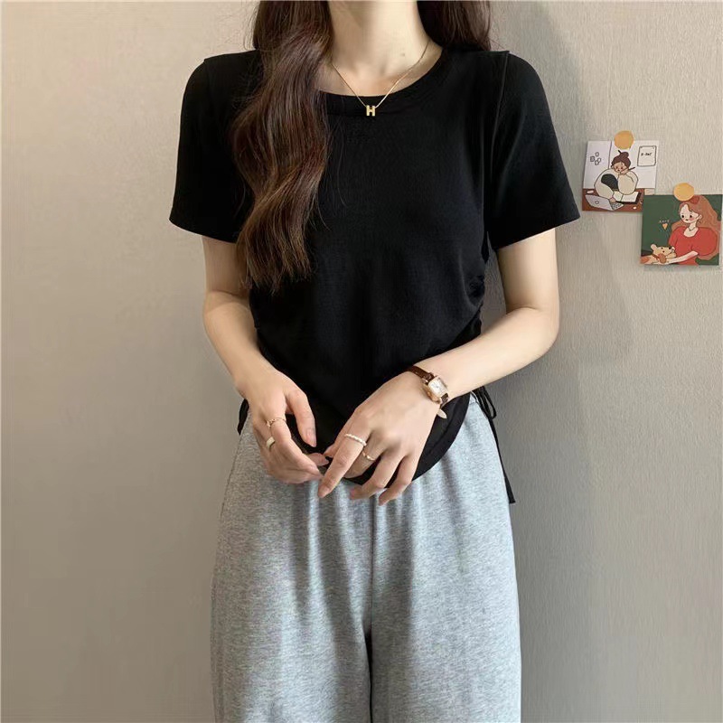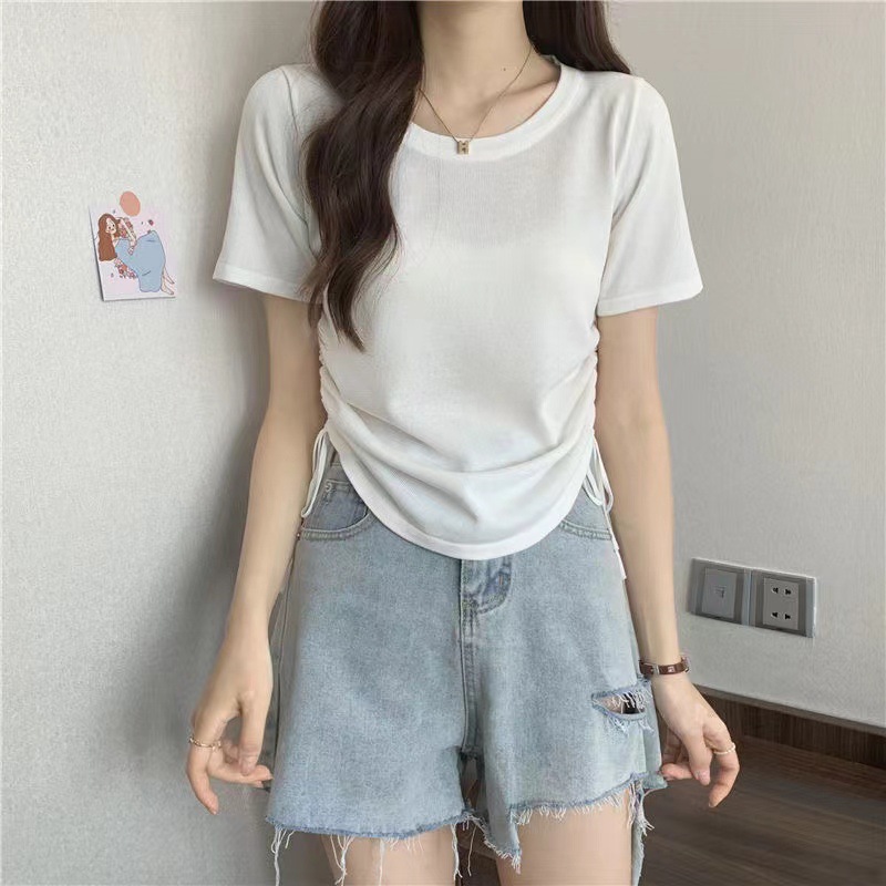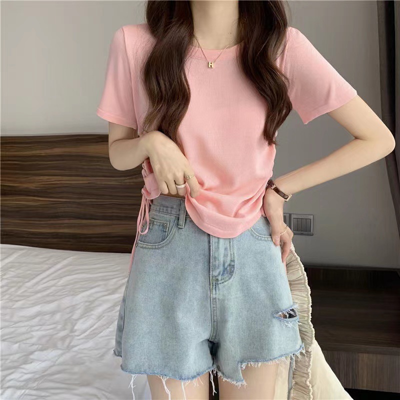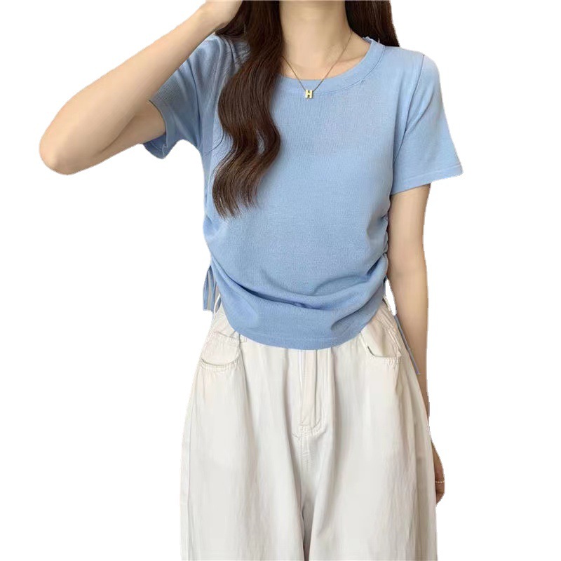 Короткая футболка с круглым вырезом на шнурке, Женский пуловер, Женский Летний Новый маленький дизайн, милый, стройнящий с коротким рукавом