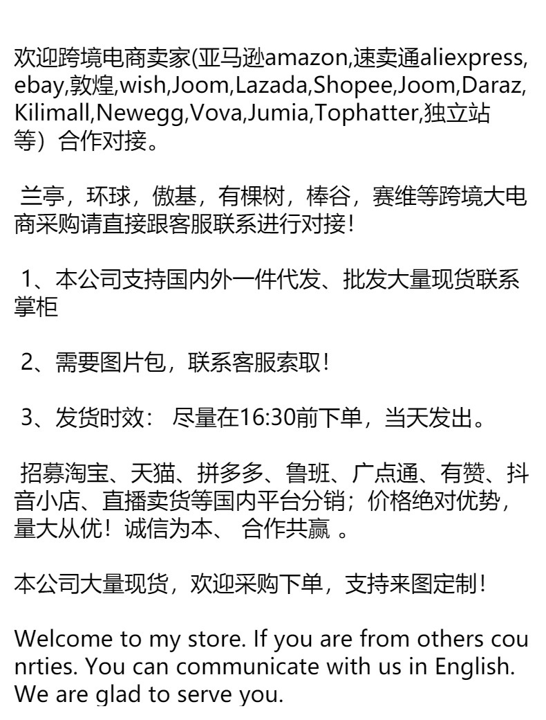 欢迎跨境电商卖家(亚马逊amazon,速卖通aliexpress,ebay,敦煌,wish,Joom,Lazada,Shopee,Joom,Daraz,Kilimall,Newegg,Vova,Jumia,Tophatter,独立站等)合作对接。