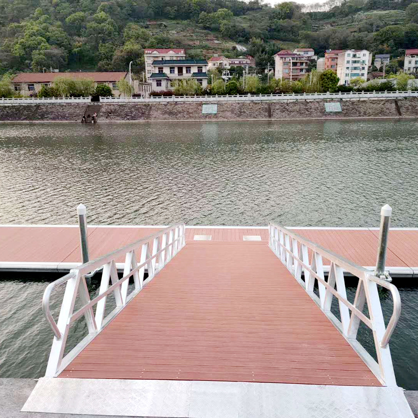 新型铝合金游艇码头采用航海级的6061铝合金,T6热处理,MIG焊制而成,表面经过科学的处理,增强了框架的抗氧化能力和抗腐蚀能力,具备良好的耐腐蚀性,适用于江河湖海,通用性强。浮桥表面可选用进口户外防腐松木,塑木,坤甸木作为铺板材料。经过严格测试,产品质量达到国外先进水准。