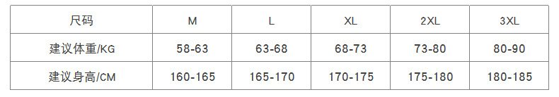 М (рекомендуется 58.5-63kg ); L (рекомендуется 63.5-68kg ); XL (рекомендуется 68.5-73kg ); 2XL (рекомендуется 73.5-80kg ); 3XL (рекомендуется 80.5-90kg )