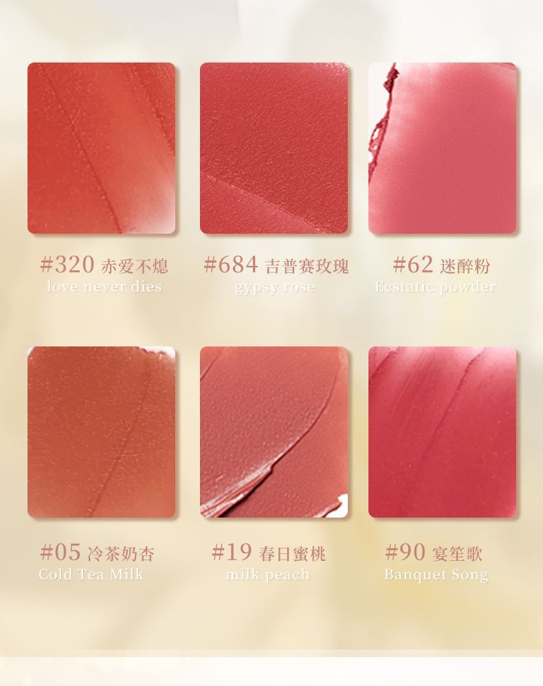 05 # холодный чай абрикосовое молоко; 19 # весенний персик; Отравленный порошок 62 #; 90 # Пир и пой; 320 # Красная любовь; 684 # Цыганская Роза