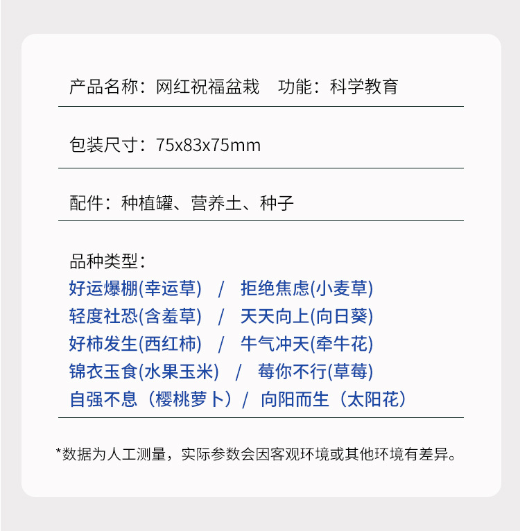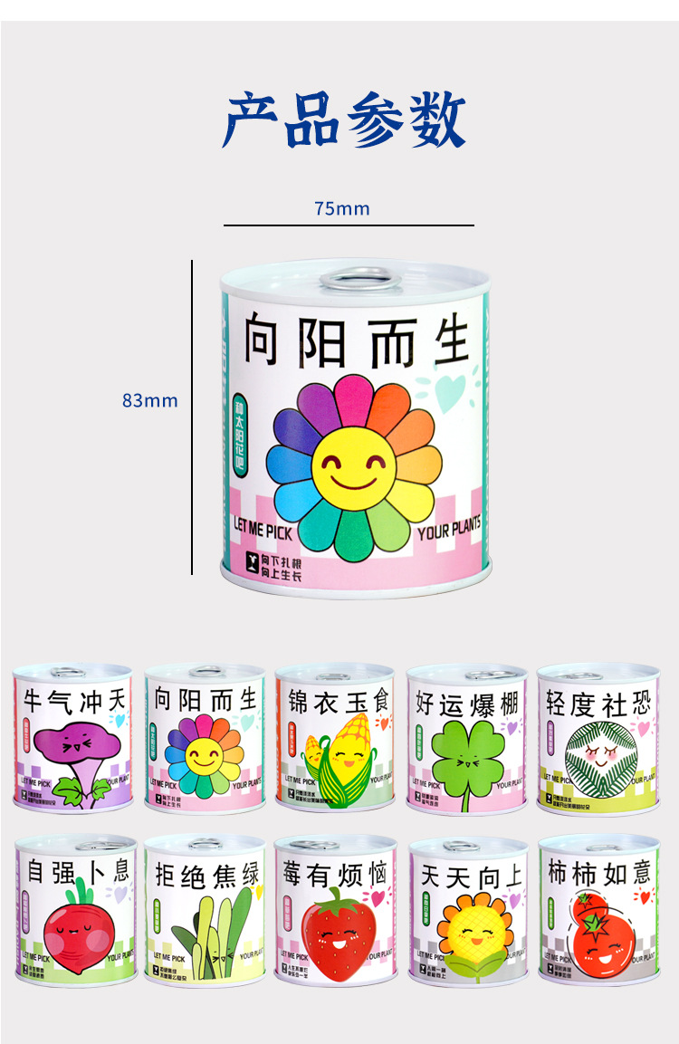 (Подсолнух) растет каждый день; (Томат) Хороший хурма случается; (Клевер) Удачи; (Мимоза) Легкая социальная тревога; (Клубника) Клубника, ты не сможешь это сделать; (Кукуруза) Роскошная еда; (Плющевидная лиана) Более высокая; Пшеничная трава: выращивание травы для вас; (Вишневый Редис) Самосовершенствование и долголетие; (Подсолнух) Рожденный к солнцу; Слепая коробка (случайная) высотой 7,5*8,3 см, стильная; (Мята) Освежающий; (Гипсофила) полная счастья; (Космос) Заработай немного денег; (Салат) Гармония приносит богатство; (Fengxianhua) Цветы в гроздьях; (арбуз) посей арбуз и получи арбуз