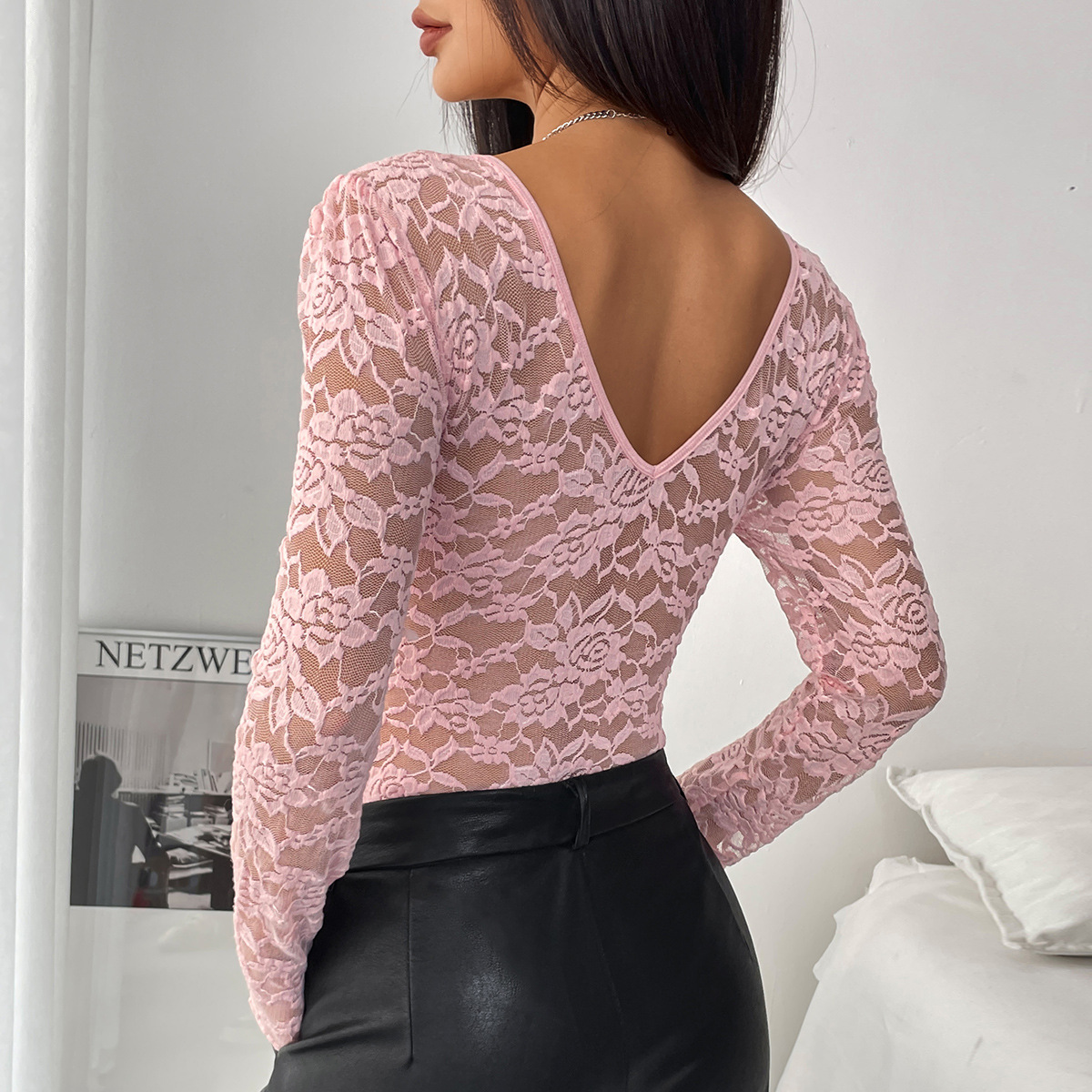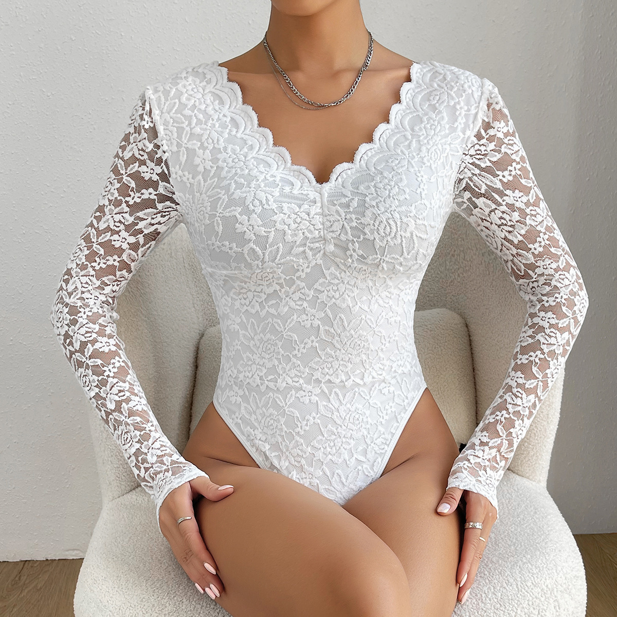 Трансграничная Внешняя торговля Амазонки горячие продажи сексуальный сплошной цвет кружева с длинным рукавом Горячая Девушка Перспектива Тонкий комбинезон 10717