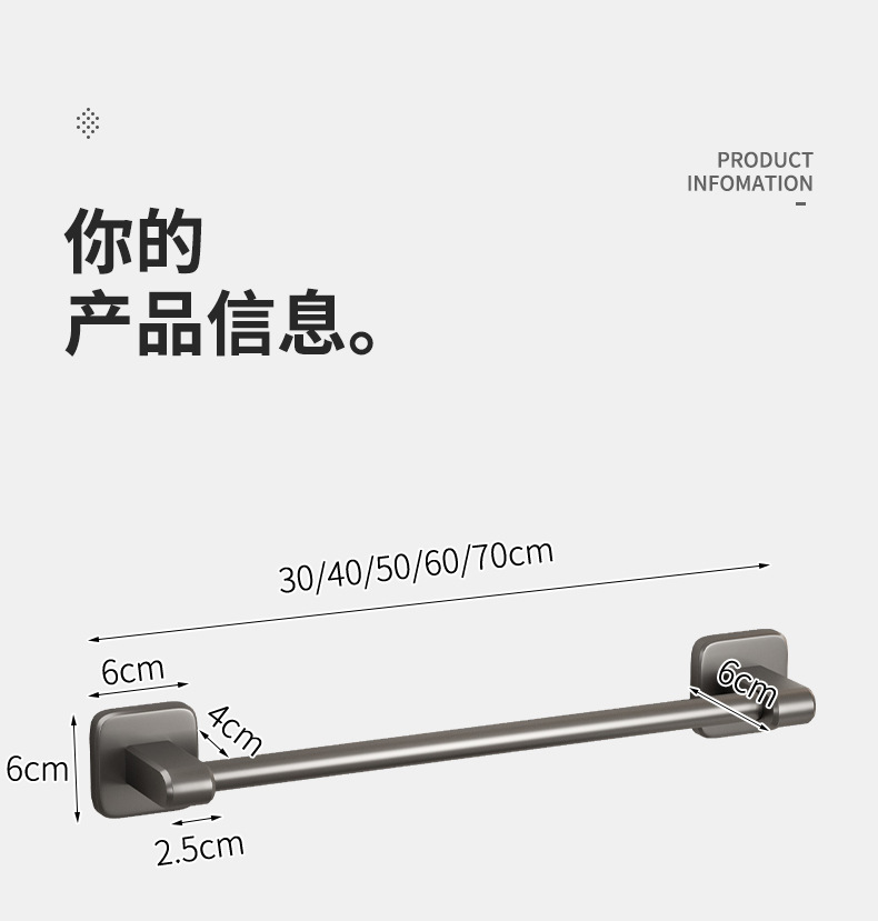 (2)安装前请务必看一下安装教程,贴片先卡一半在底座上,在墙上固定好位置后,取下毛巾架,将墙上的贴片挤压一下,将贴片中的空气排出后,方可扣上毛巾架使用了。