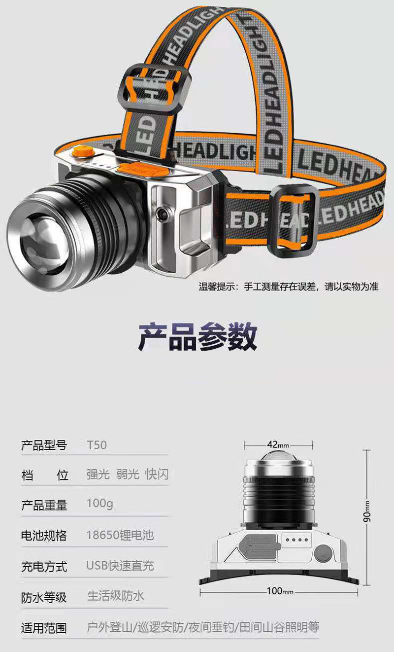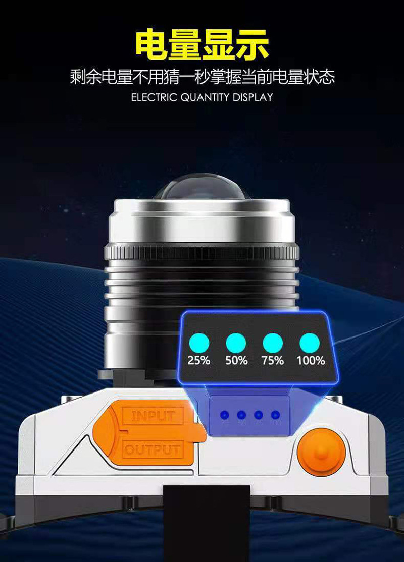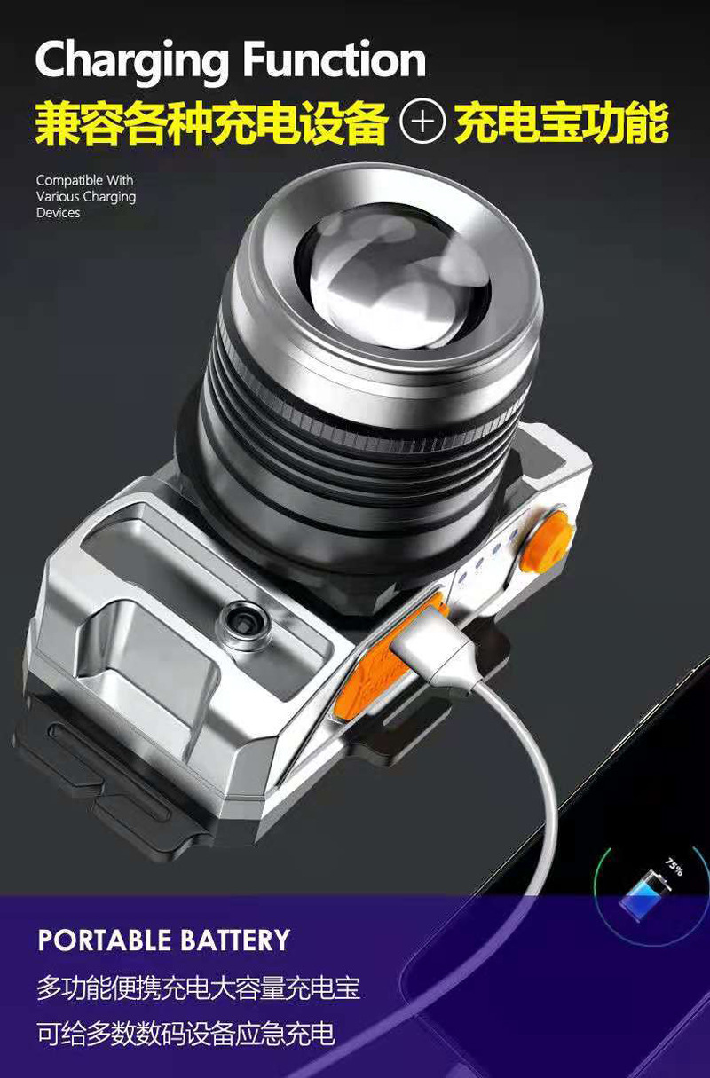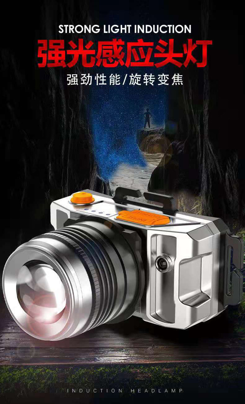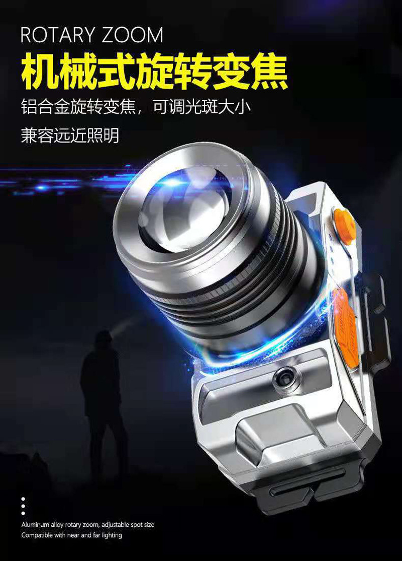 产品功能:高亮-低亮-SOS(长按开关3秒头部爆闪启动感应功能)260-100流明头部可上下60度调节照射角度,带感应功能。USB输入和输出双功能。