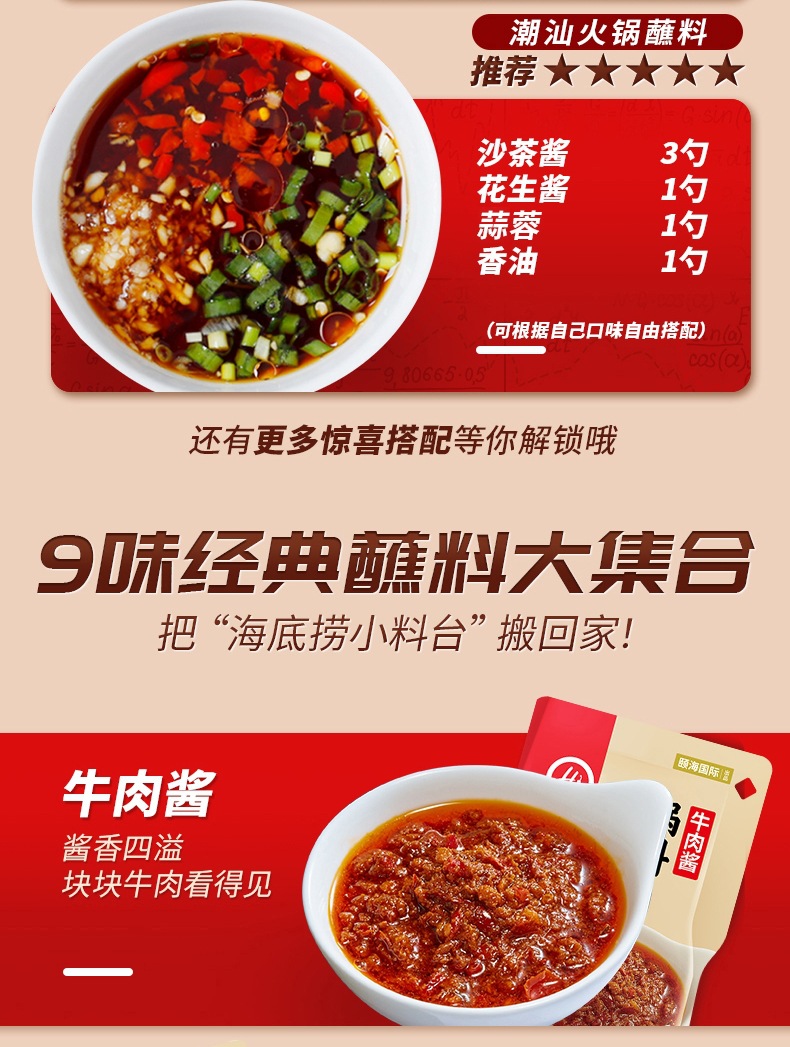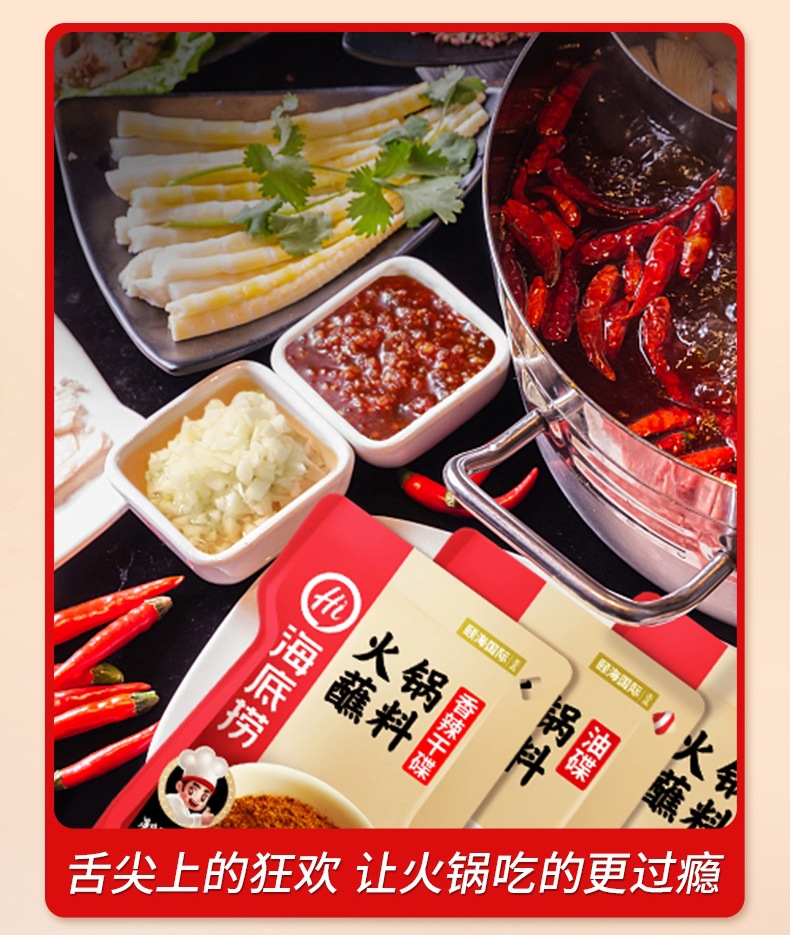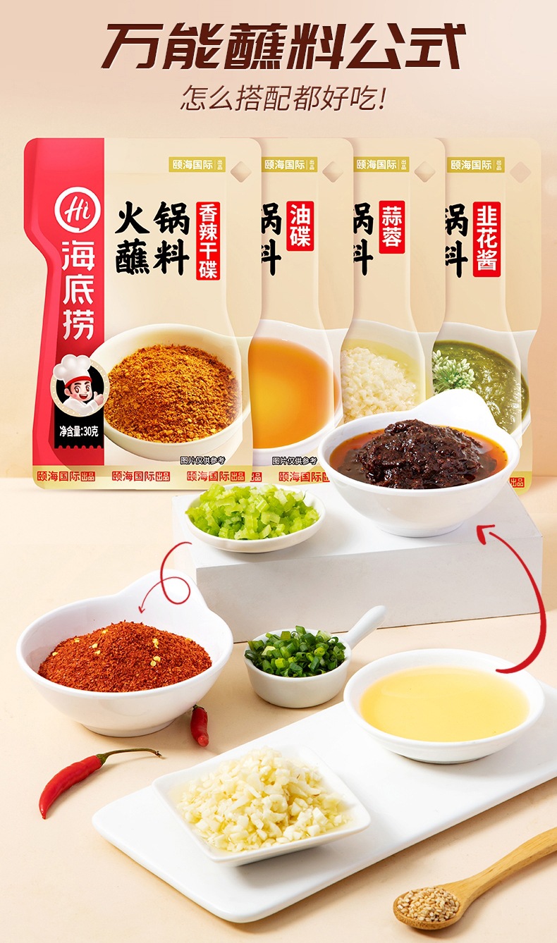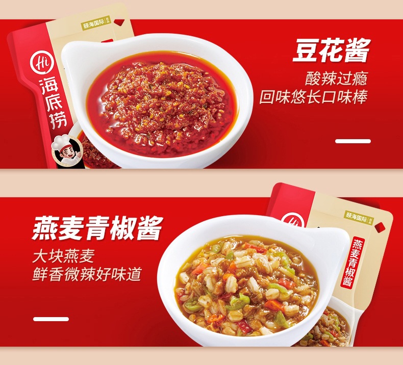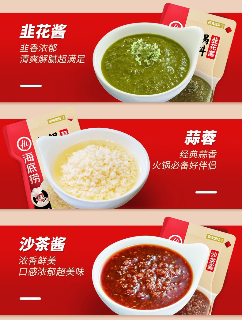 Соус для говядины Haidilao 80 г/пакет; Haidilao сушеные гребешки окунающий материал 80 г/пакет; Haidilao чесночный соус для погружения 90 г/пакет; Арахисовый кунжутный соус Haidilao 100 г/пакет; Haidilao песок чайный соус погружной материал 80 г/пакет; Соус для овшенных цветков Haidilao, 100 г/пакет; Оригинальный ароматизатор соуса Haidilao 120 г/пакет; Пряный соус для окунания Haidilao 120 г/пакет; Острый соус Haidilao 120 г/пакет; Соус для окунания со вкусом морепродуктов Haidilao 120 г/пакет; Haidilao соус для окунания ароматом тмина 120 г/пакет; Пряное сухое блюдо Haidilao 30 г/пакет; Чесночные чипсы Хайдило 30 г/пакет; Соус из жареного перца Хайдило 80 г/пакет; Острый соус Хайдило 80 г/пакет; Сок из красной ферментированной сои Хайдило, 80 г/пакет; Белые семена кунжута Haidilao, 50 г/пакет