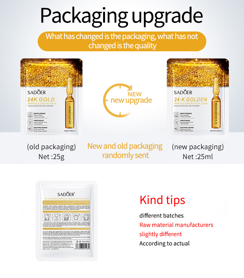 Маска ампула золота 24 К 25 г; Маска с витамином С/25 г [только на экспорт, продажа запрещена на внутреннем рынке, покупка является отказом от ответственности по умолчанию]; Маска с гиалуроновой кислотой/25 г [только для экспортных продаж, запрещены внутренние продажи, покупка является отказом от ответственности по умолчанию]