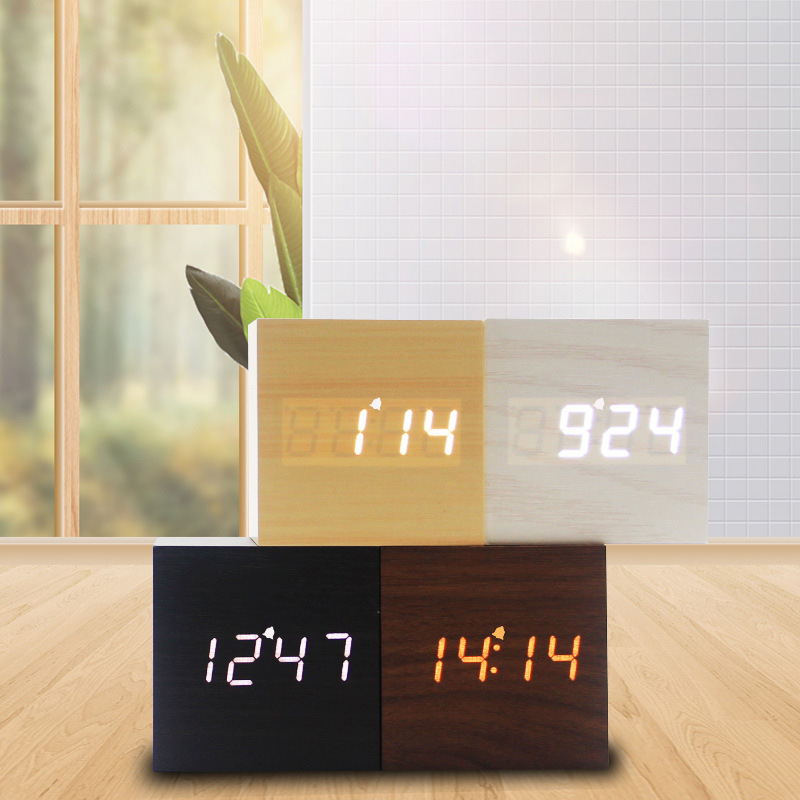 《新款推荐》正方形家居卧室LED数显夜光静音声控充电闹钟 LED木头钟滴滴声闹铃款-升级版