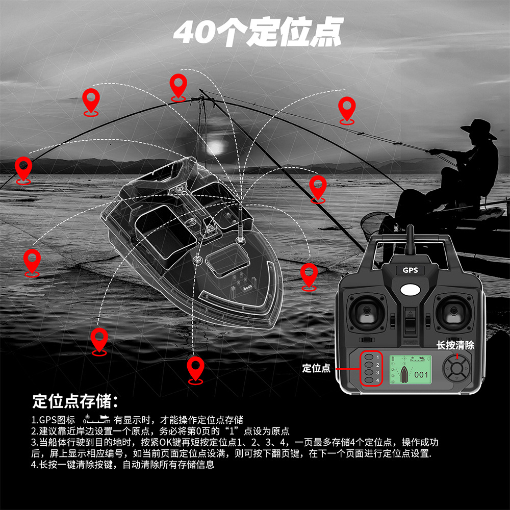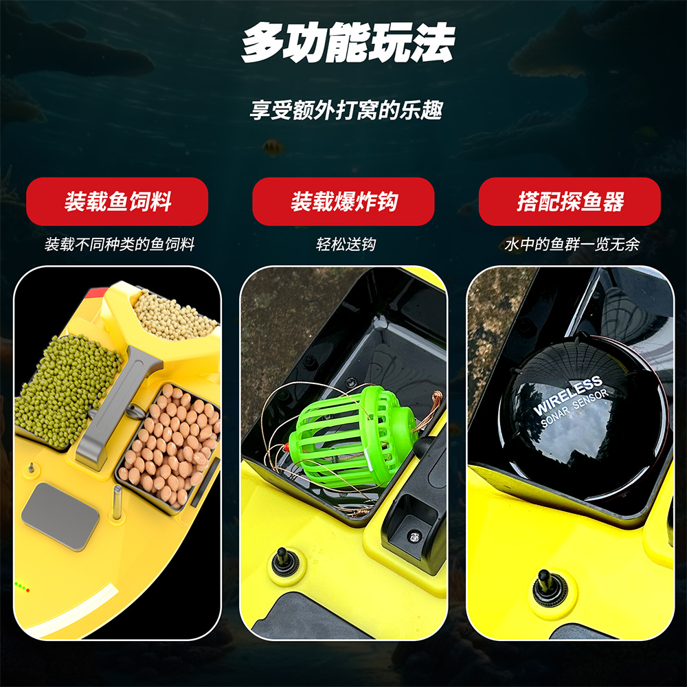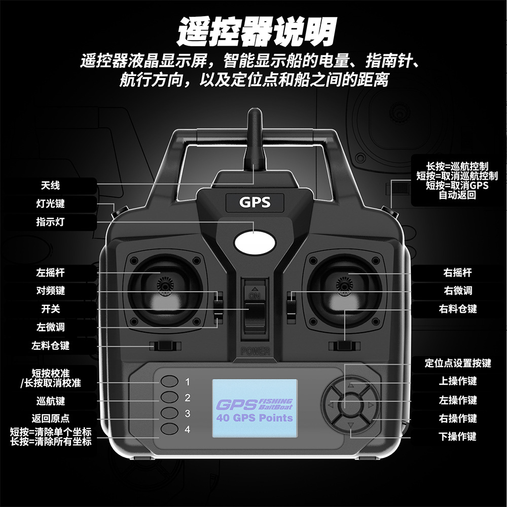 1.前进后退、左右转、夜钓灯、3仓打窝、送钩