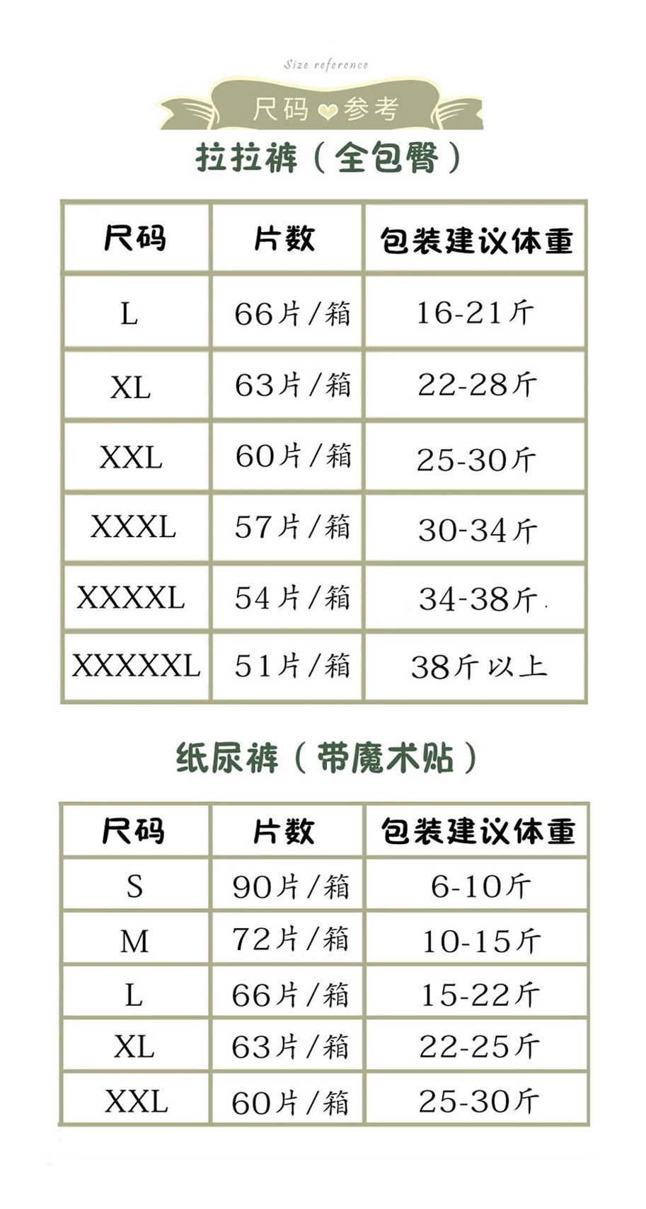 [Полные бедра] Кружевные брюки L Код 66 Штуки рекомендуют 8,00-10,50 кг; [Полные бедра] Кружевные брюки Код XL 63 Штуки рекомендуется 11,00-14,00 кг; [Full Hip] Подтягивающие штаны 2XL код 60 штук рекомендуется 12,50-15,00 кг; [Полные бедра] Кружевные брюки 3XL Код 57 Штуки рекомендуется 15,00-16,00 кг; [Полные бедра] Кружевные штаны 4xL Код 54 штуки рекомендуется 16,00-19,00 кг; [Комплексная попа] Брюки с подтяжками, размер 5xL, 51, рекомендуется 19kg или выше.; [Крючок и петля] подгузник NB код 60 рекомендуется 2,50-4,00 кг; [Крючок и петля] подгузник S код 90 Рекомендуется 3,00-5,00 кг; [Крючок и петля] подгузники M Code 72 рекомендуют 5,00-7,50 кг; [Крючок и петля] подгузники L код 66 рекомендуют 7,50-11,00 кг; [Крючок и петля] подгузники XL размер 63 рекомендуют 11,00-12,50 кг; [Крючок и петля] подгузники 2XL код 60 рекомендуют 12,50-15,00 кг