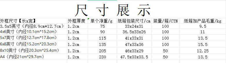 3.5x5inch (внутренний диаметр 8,9 см*12,7 см); 4x6inch (внутренний диаметр 10,1 см*15,2 см); 5x7inch (внутренний диаметр 12,7 см*17,8 см); 6x8inch (внутренний диаметр 15,2 см*20,3 см); 8x10inch (внутренний диаметр 20,3 см*25,4 см); А4 (внутренний диаметр 21см*29,7см)