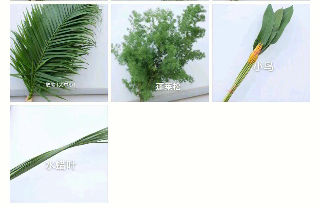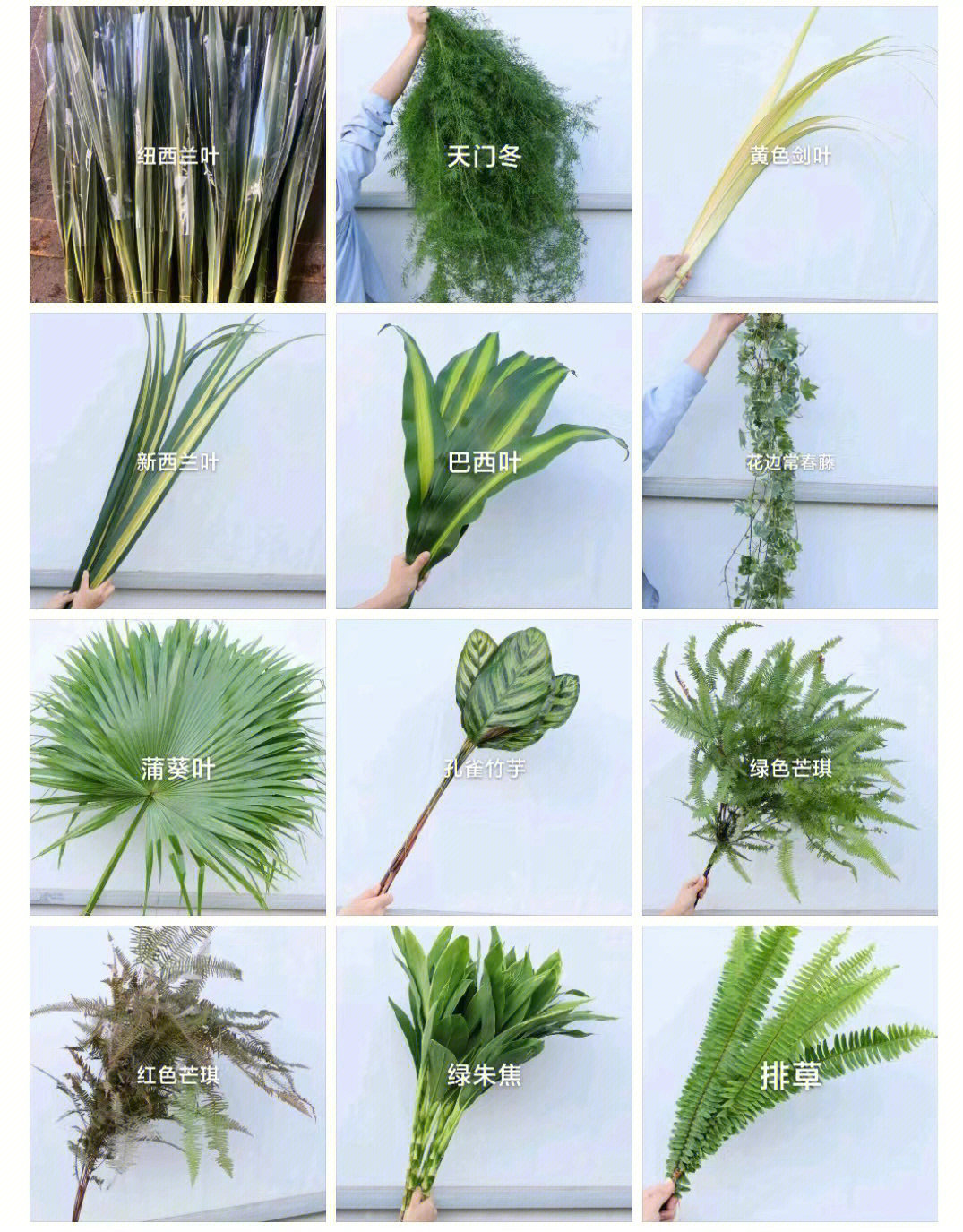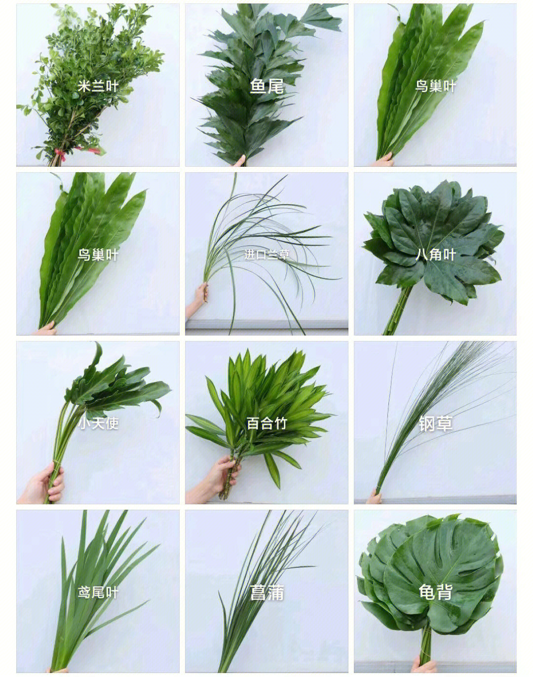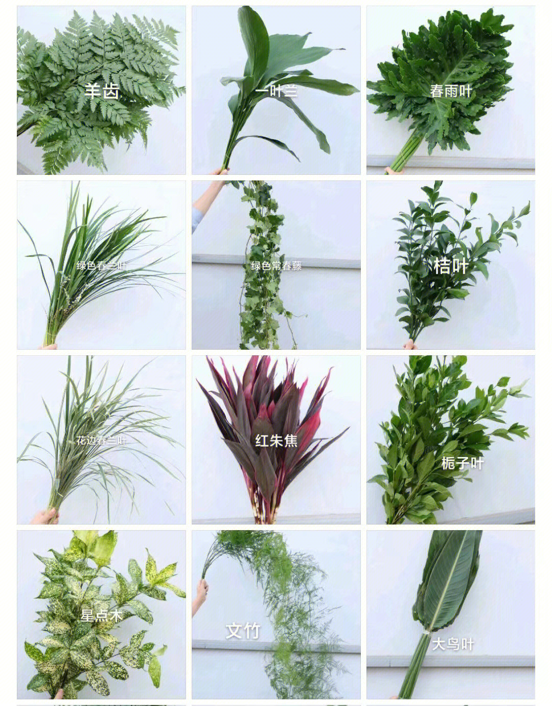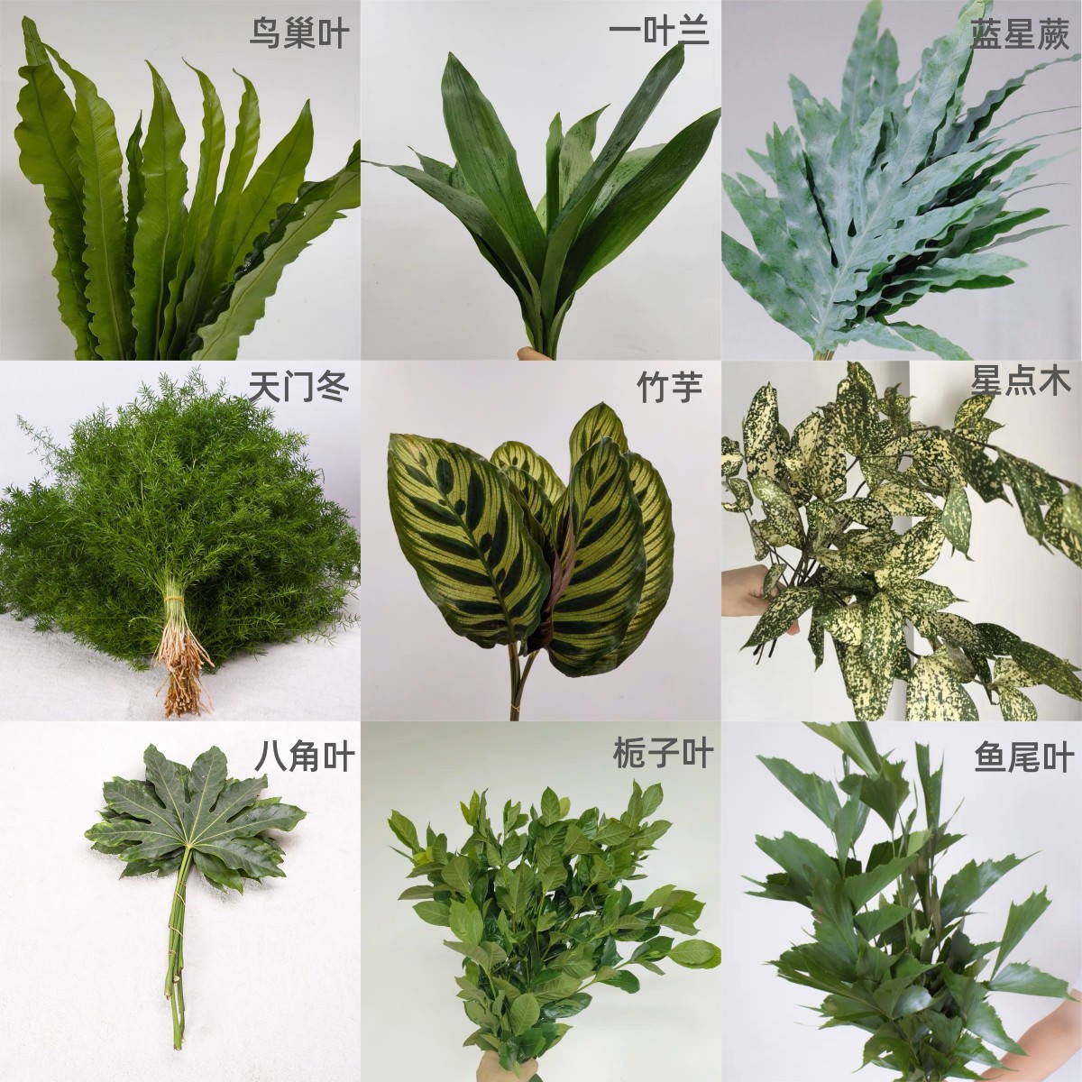 Листья папоротника (1 пучок из 10 ветвей); Листья черепахи (1 пучок из 10 ветвей); Бразильские листья (1 пучок из 10 ветвей); Сосна Пэнглай (4-5 ветвей в 1 пучке); Расположение травы (80 ветвей в пучке); Таро (1 пучок, 10 ветвей); Листья гардении (8-10 ветвей в 1 пучке); Спаржа (8-10 ветвей в 1 пучке); Листья птичьего гнезда (1 пучок из 10 веток); Синяя звездчатая папороть (1 пучок из 10 ветвей); Листья ириса (1 пучок из 5 ветвей); Листья апельсина (1 пучок, 10 ветвей); Орхидея однолистная (1 пучок из 10 ветвей); Листья Новой Зеландии (1 пучок из 10 ветвей); Импортированные листья весенней орхидеи (1 пучок из 5 веток); Листья весенней орхидеи зеленые (5 ветвей); Весеннее кружево из листьев орхидеи (5 ветвей); Древесина звездчатого конца (1 пучок из 10 ветвей); Лоза (1 пучок из 10 ветвей); Листья меча (1 пучок из 10 ветвей); Листья Calamus (4-5 ветвей в 1 пучке); Листья водяной свечи (4-5 ветвей в 1 пучке); Пальмовые листья (1 пучок, 5 ветвей); Листья бадьяна (1 пучок из 10 ветвей); Зеленые кленовые листья (5-8 ветвей в 1 пучке); Листья птицы рая (1 пучок из 10 ветвей); Стальная трава (1 пучок из 40 ветвей); Аспарагус (нажать на голову); Листья рыбьего хвоста (1 пучок из 10 ветвей); Свободные листья (1 пучок из 10 ветвей); Листья весеннего дождя (1 пучок из 10 ветвей); Маленький ангел (1 пучок из 10 веточек); Зеленый вермилион (1 пучок из 10 ветвей); Красный киноварь (1 пучок из 10 ветвей); Лилия бамбуковая (1 пучок, 5 ветвей); Орхидея-дракон (1 пучок из 4-5 ветвей); Розмарин (5-8 ветвей в 1 пучке)