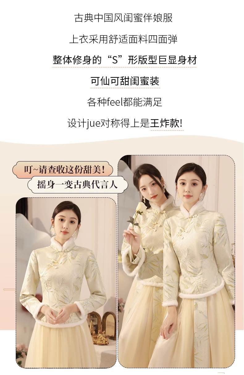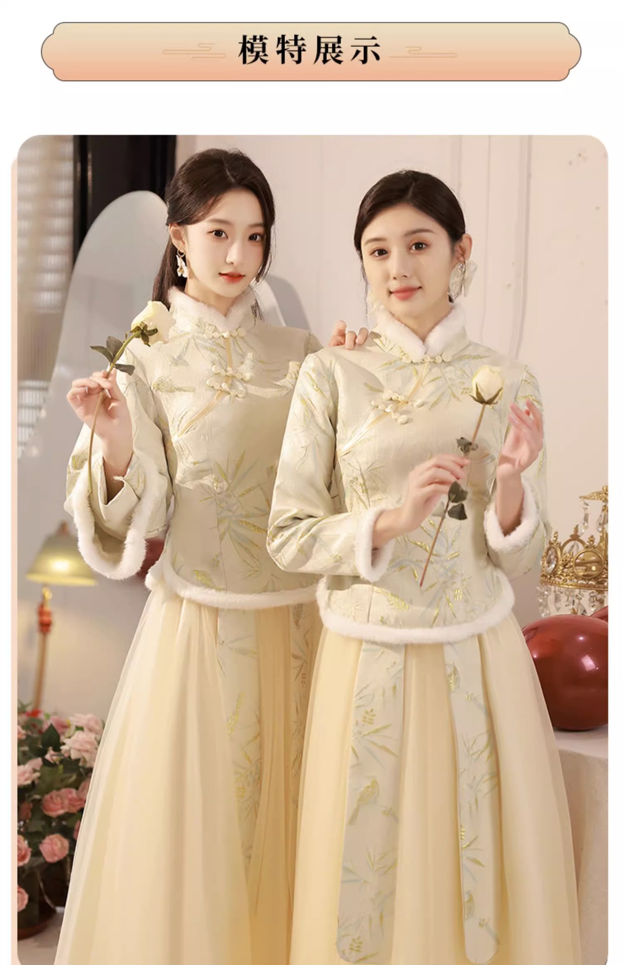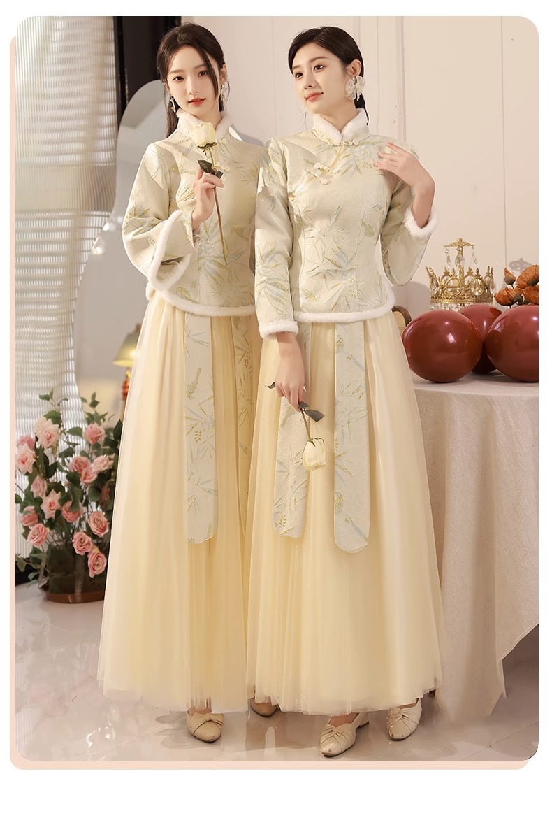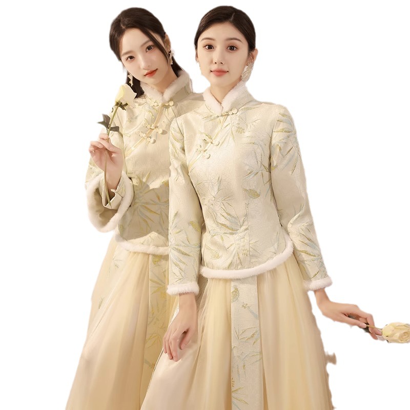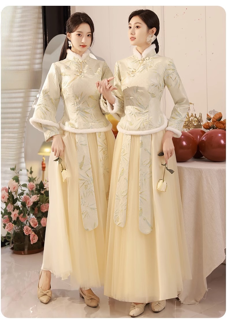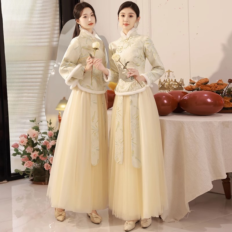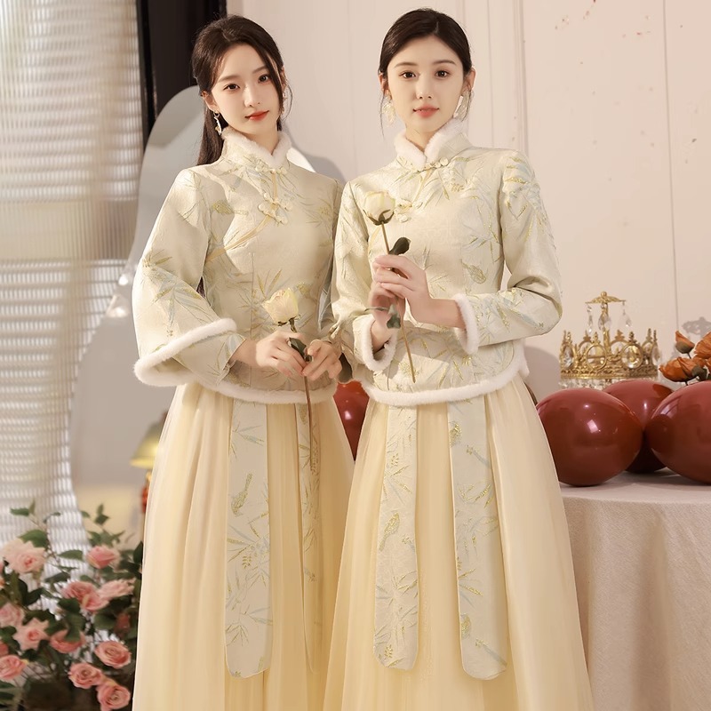 Китайские платья для подружек невесты, зимние, на флисовой подкладке, утолщенные, новинка 2025 года, с длинными рукавами, в традиционном китайском стиле, для группы подружек невесты, теплые и элитные.