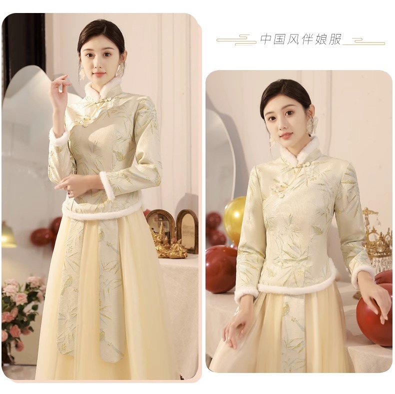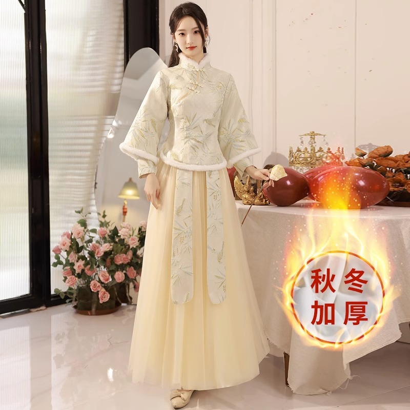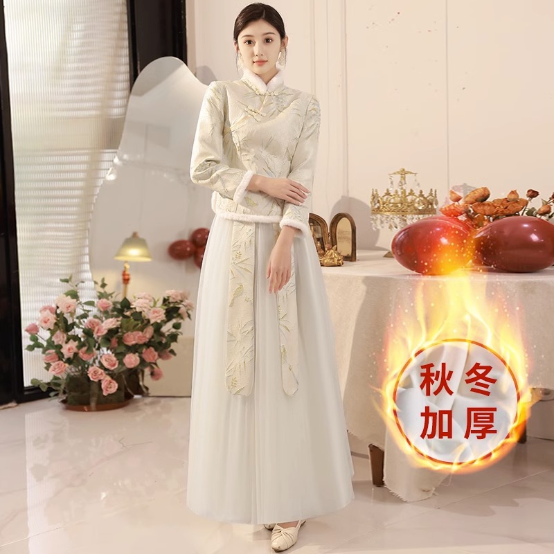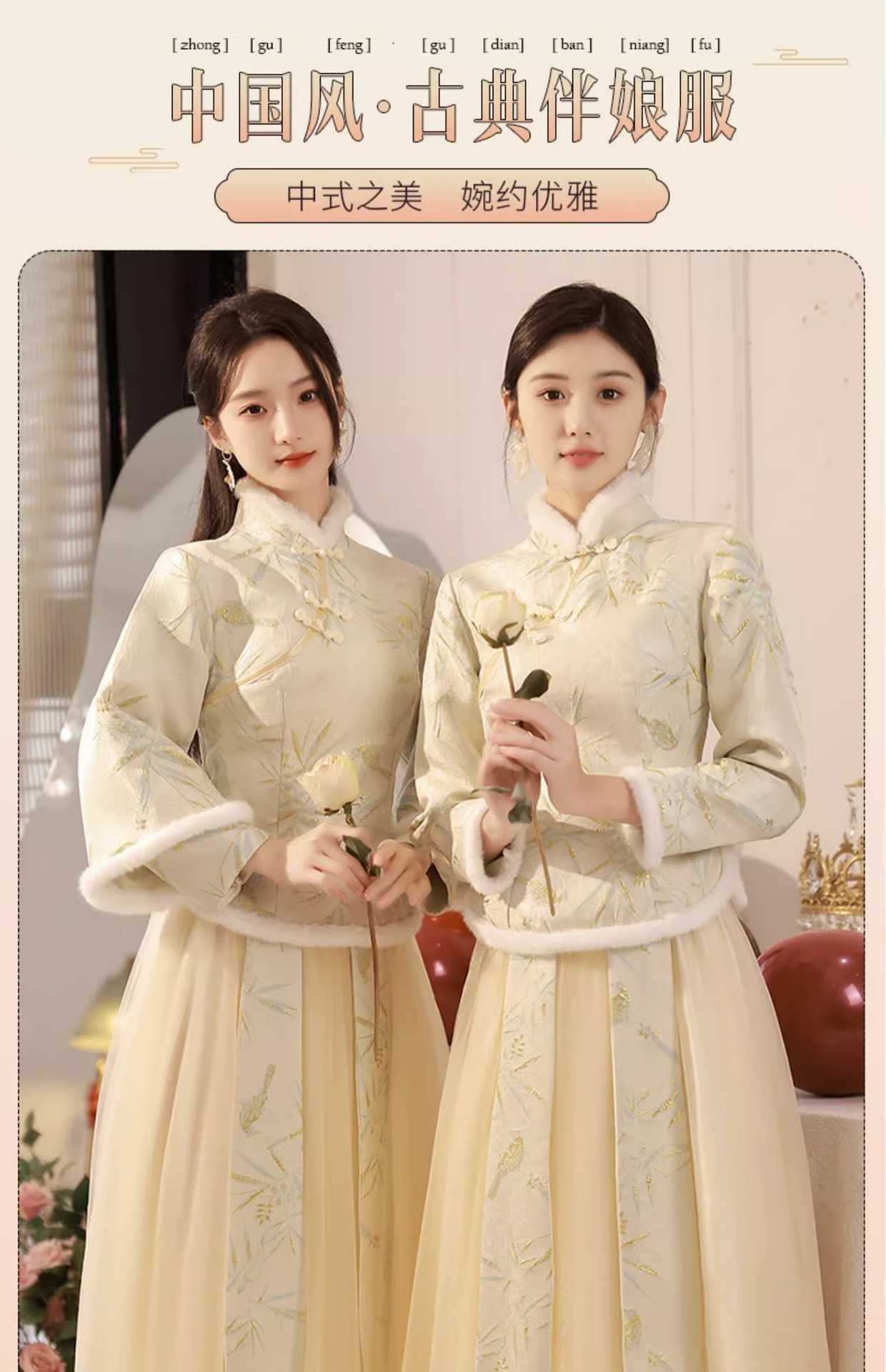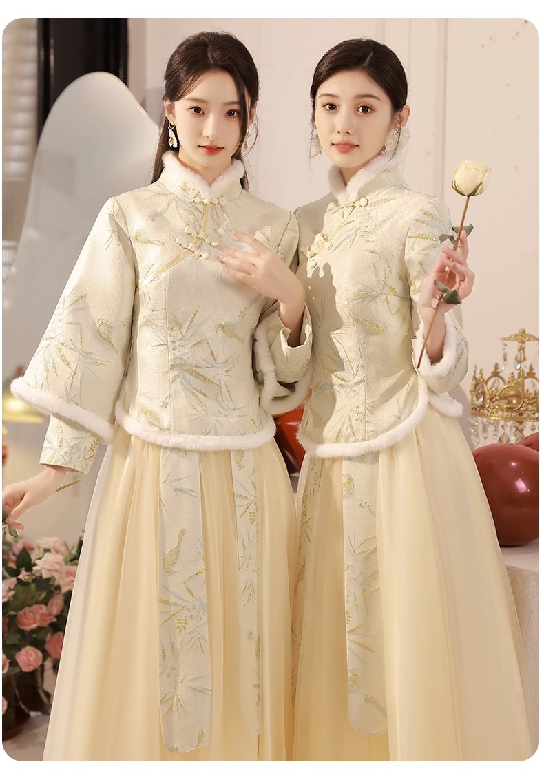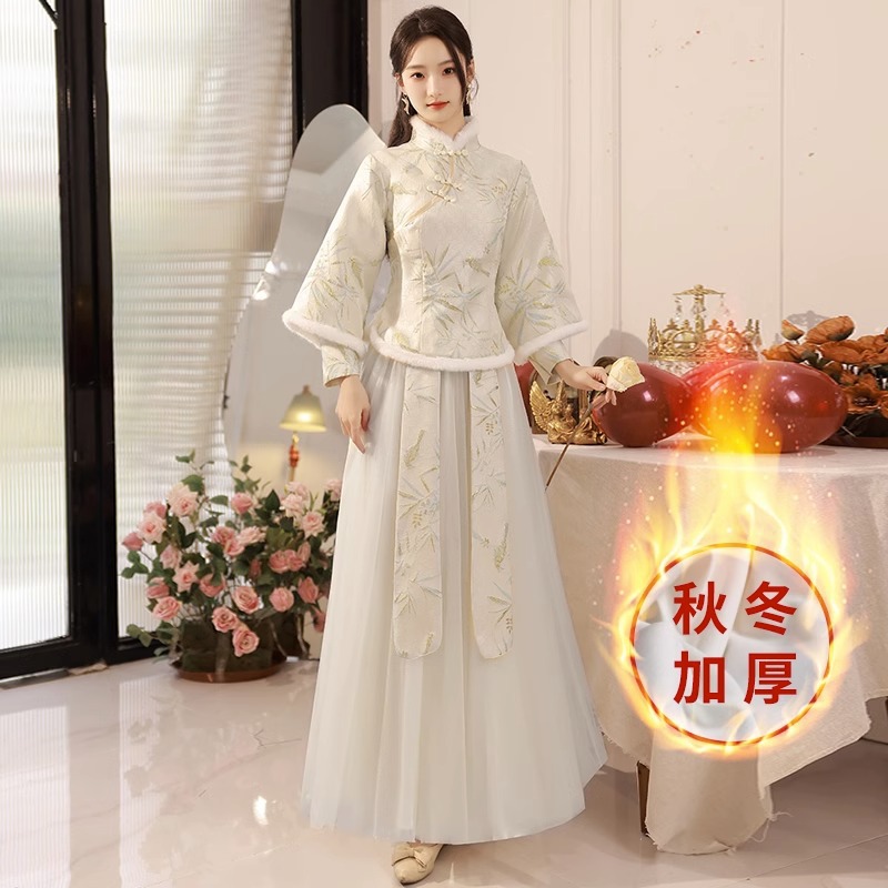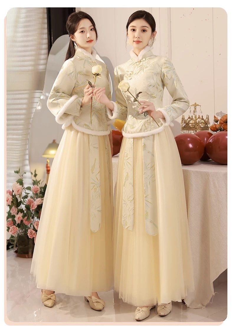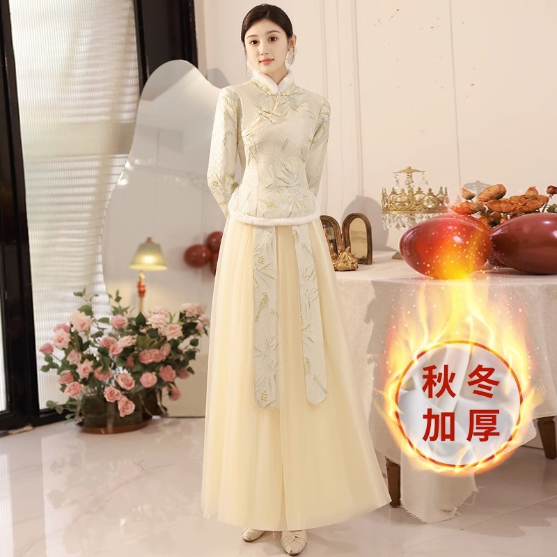 Китайские платья для подружек невесты, зимние, на флисовой подкладке, утолщенные, новинка 2025 года, с длинными рукавами, в традиционном китайском стиле, для группы подружек невесты, теплые и элитные.