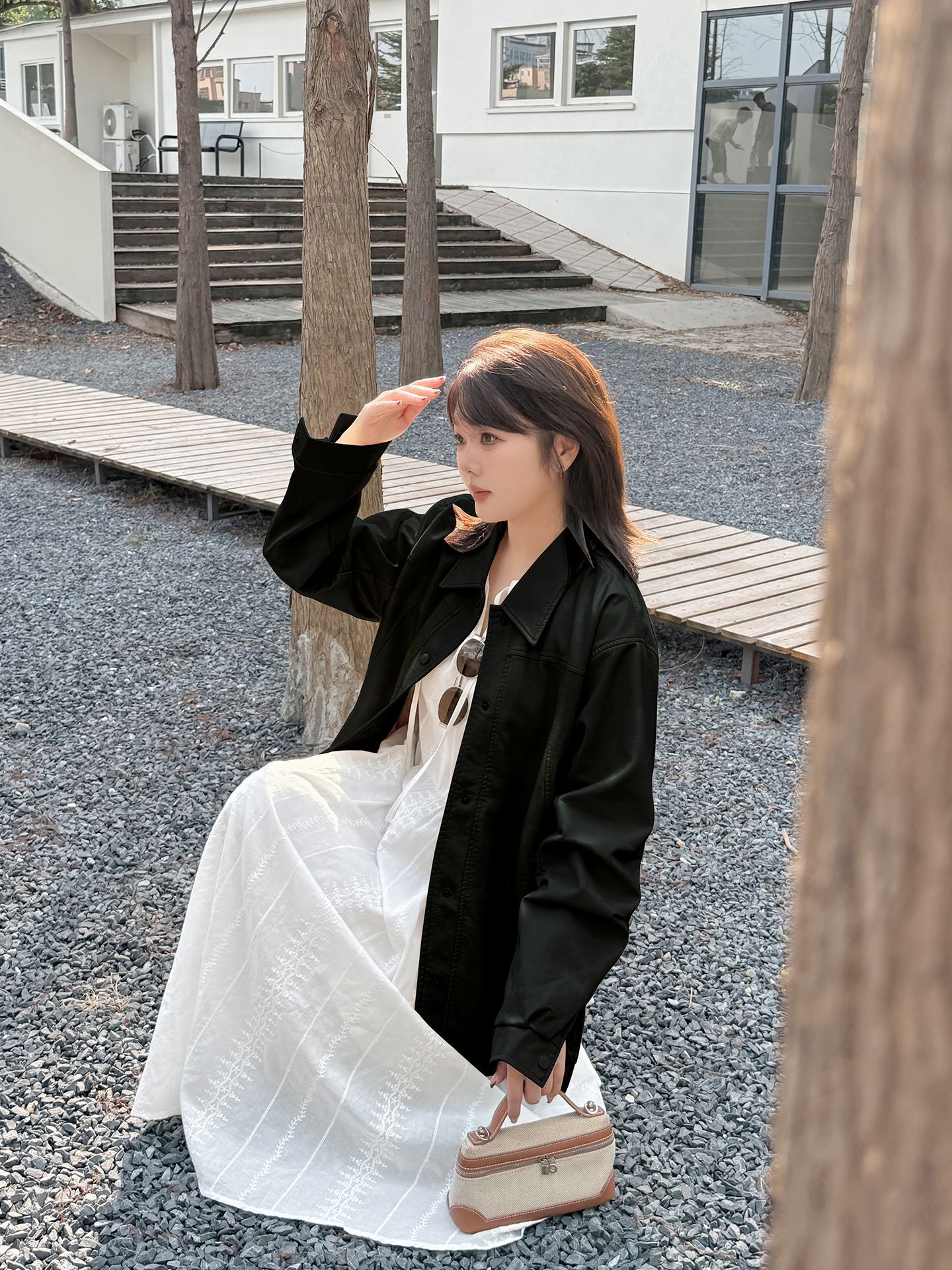 敲实穿的皮衣外套