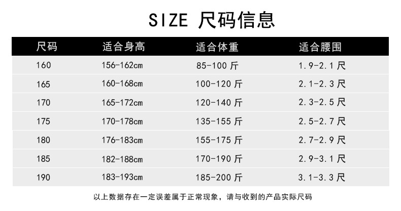 160/S; 165/М; 170/л; 175/XL; 180/xxl; 185/xxxl; 190/XXXXL