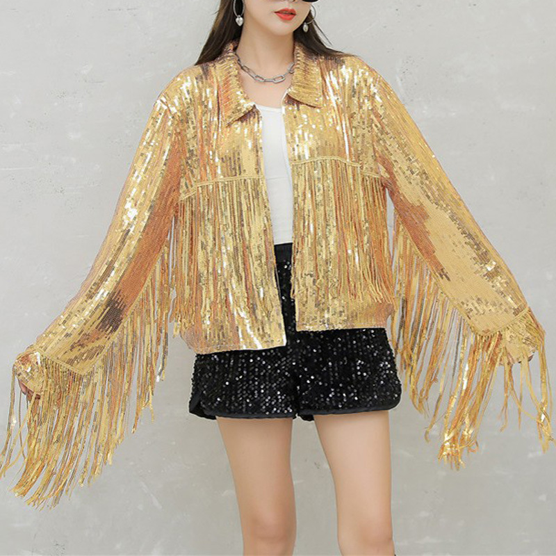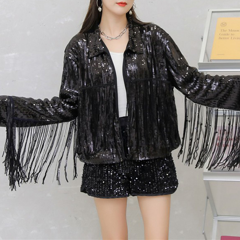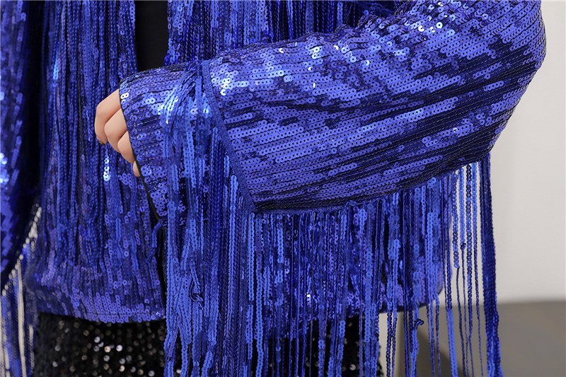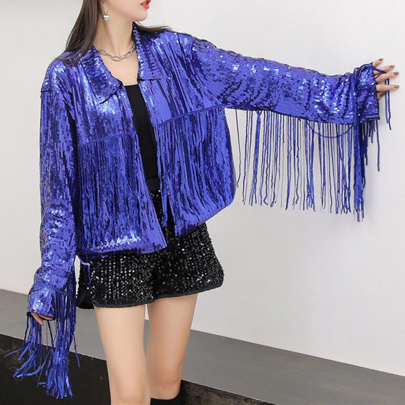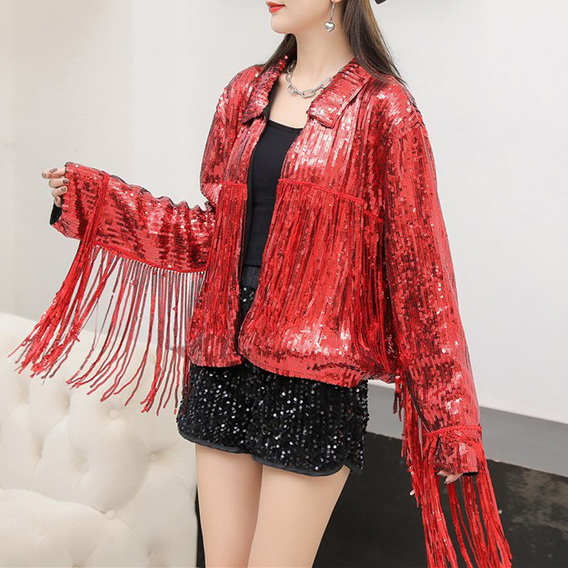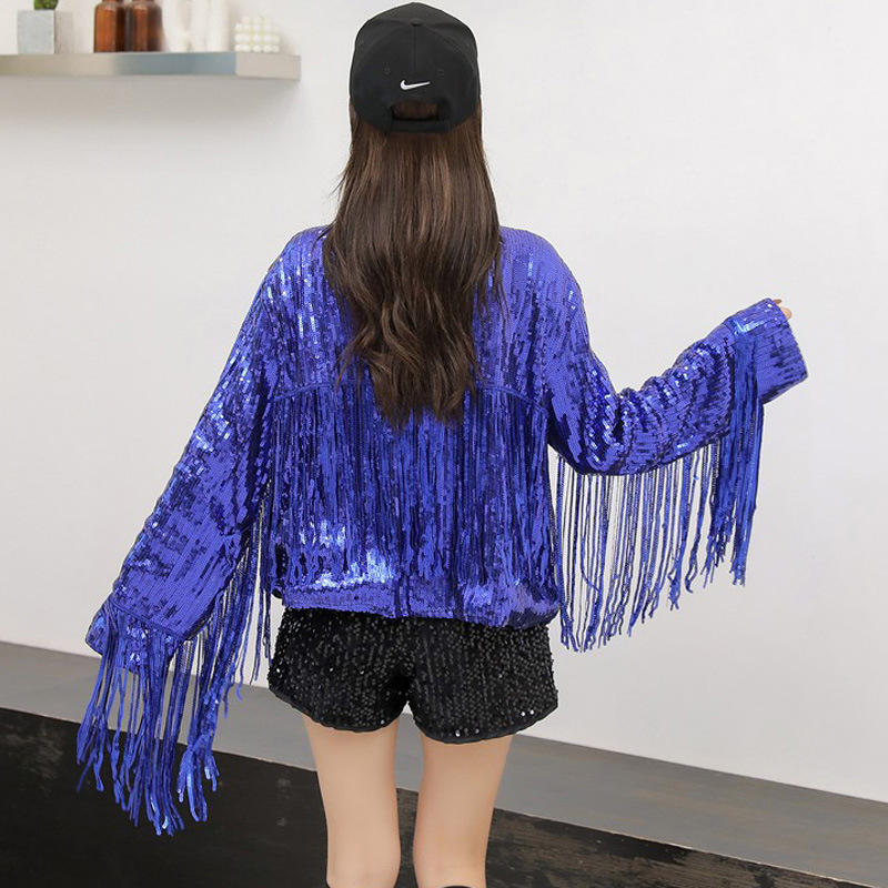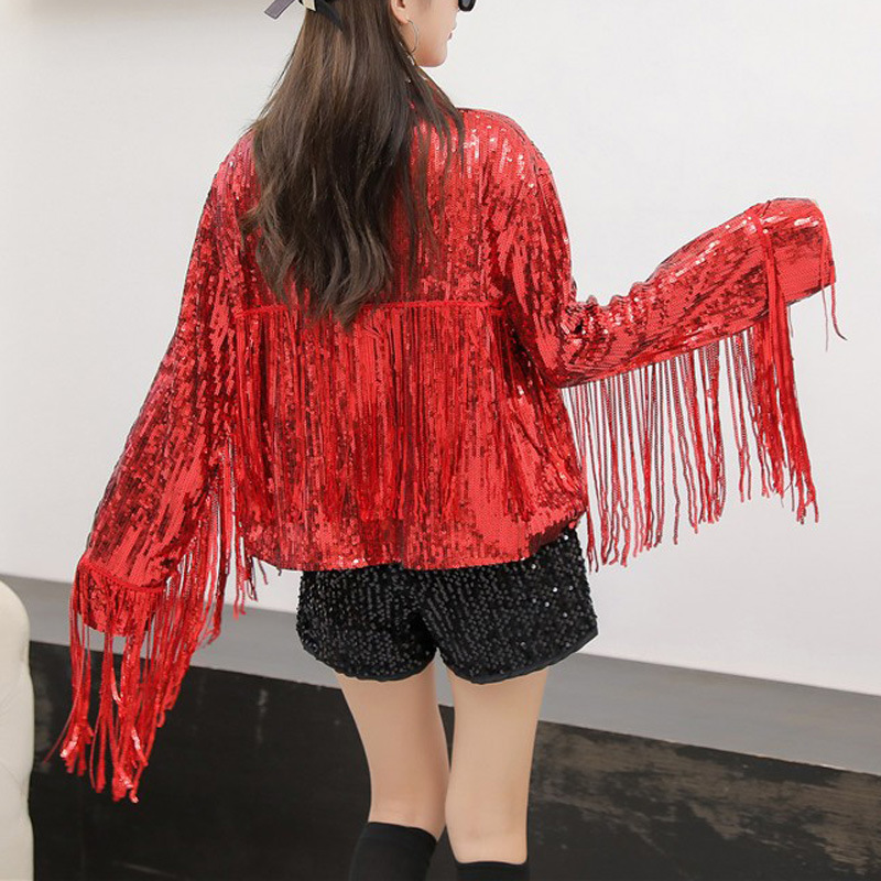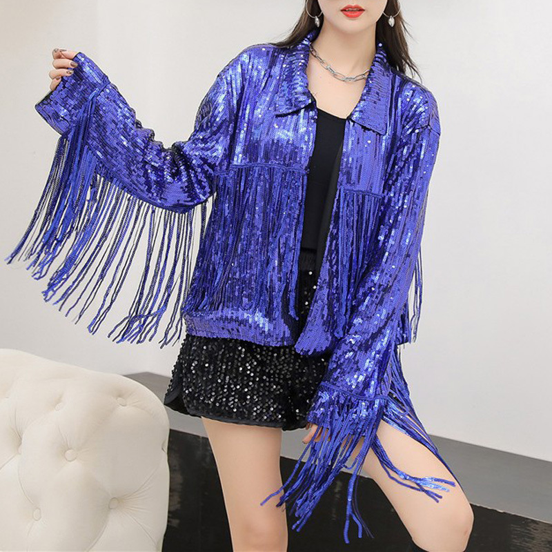 Кардиган с пайетками и длинными бахромами в европейском и американском стиле, костюм для выступлений чирлидеров, кардиган-жакет для вечеринок, ежегодных встреч и выступлений.