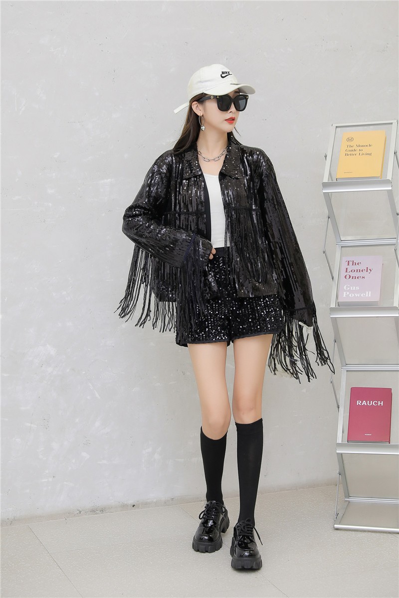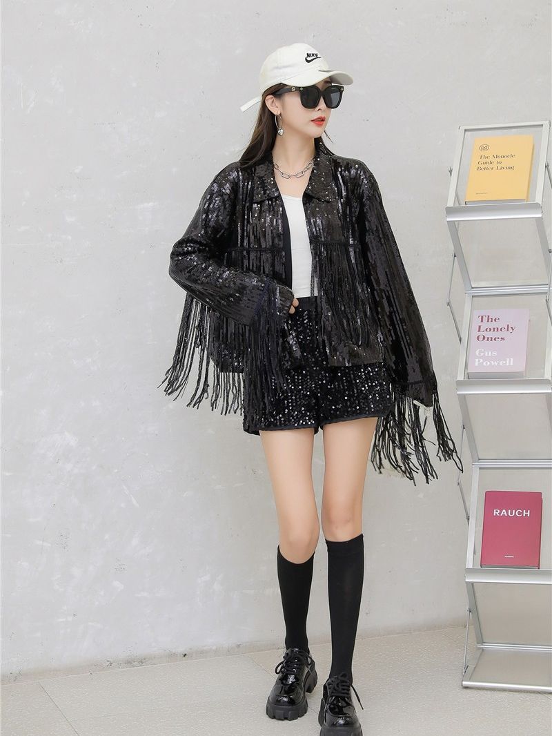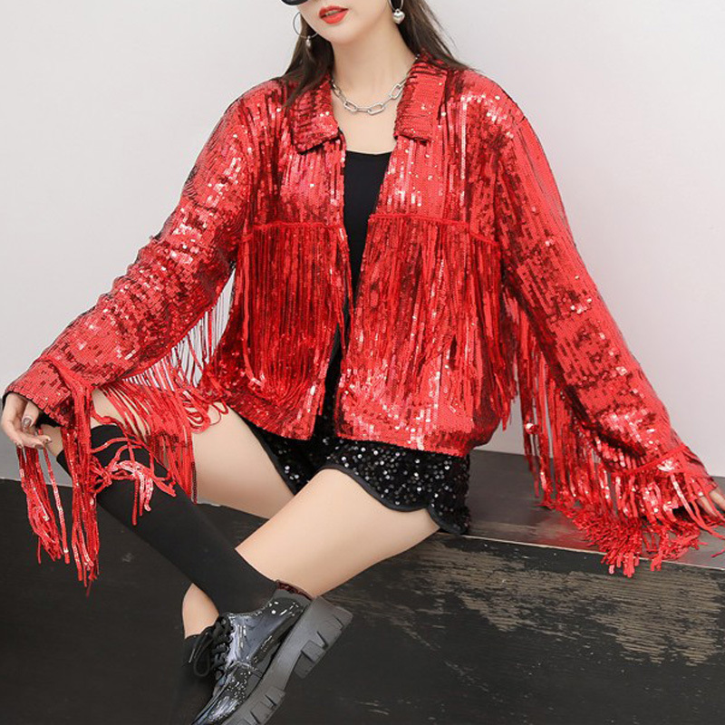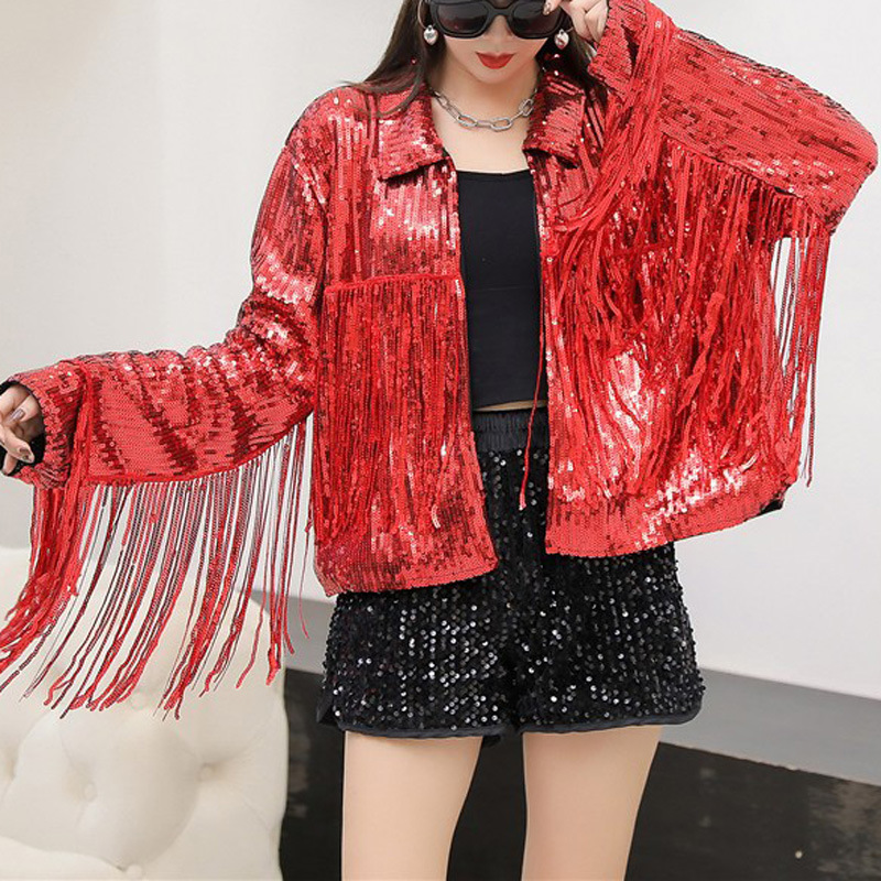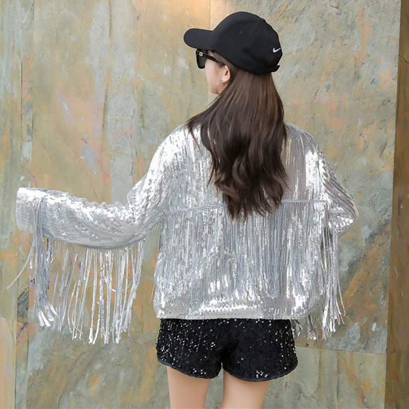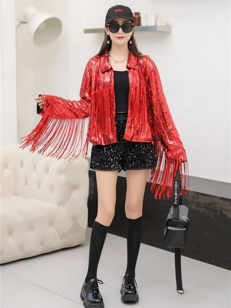 Кардиган с пайетками и длинными бахромами в европейском и американском стиле, костюм для выступлений чирлидеров, кардиган-жакет для вечеринок, ежегодных встреч и выступлений.