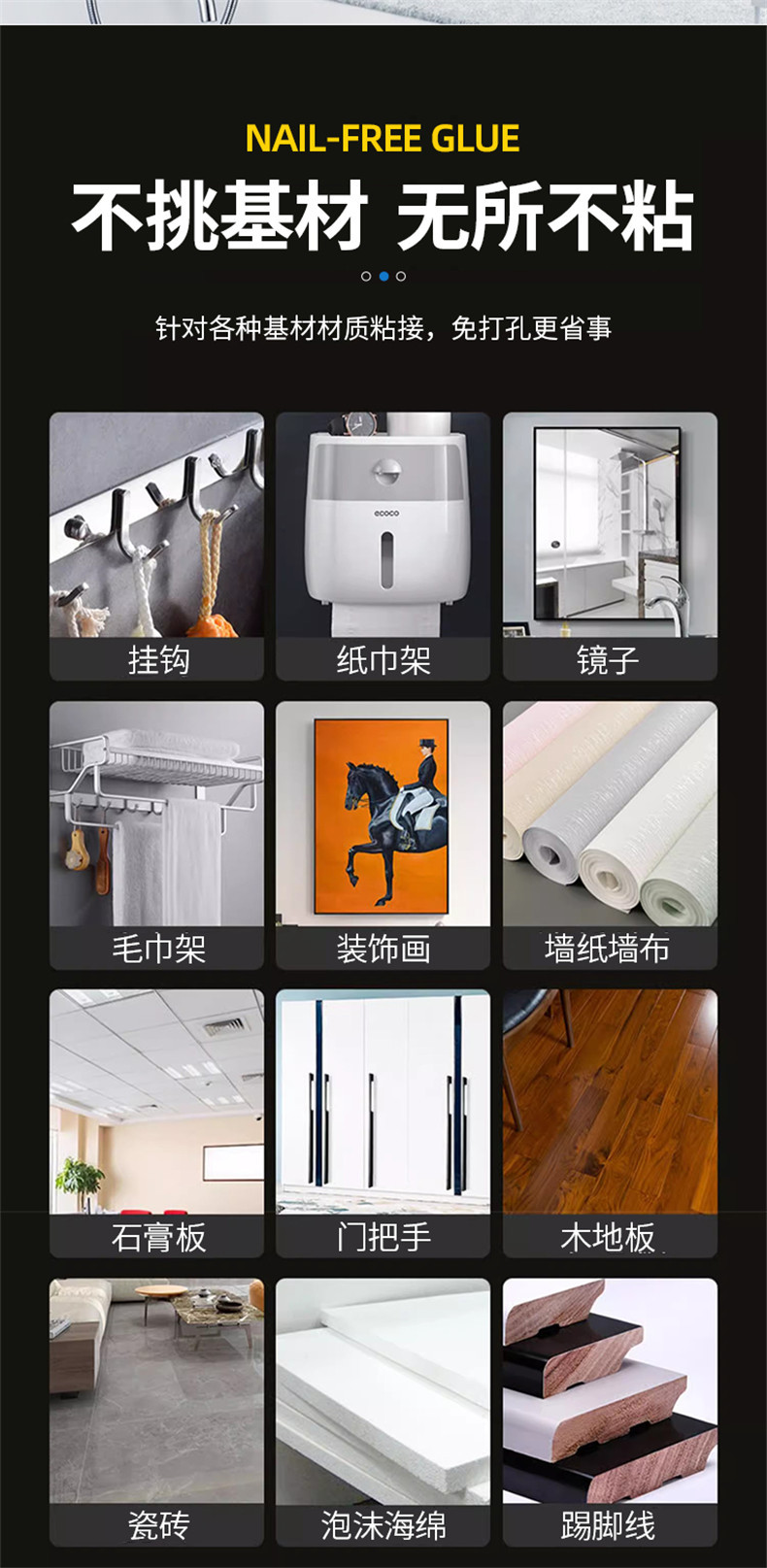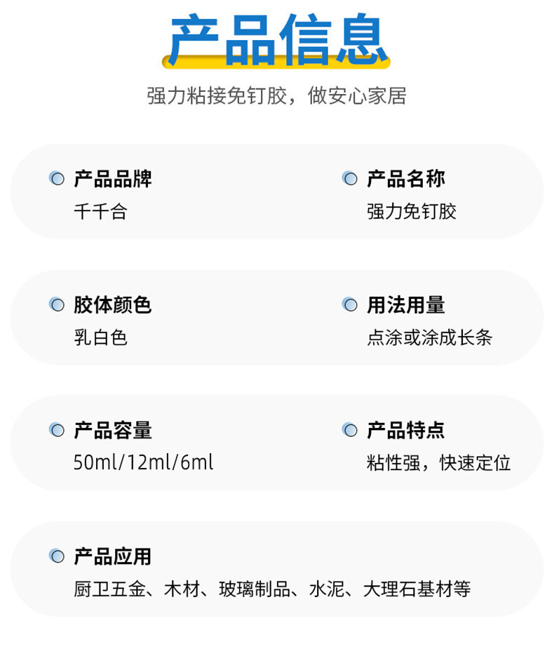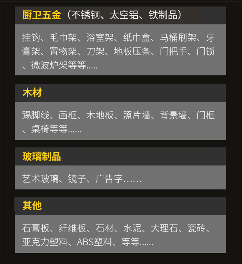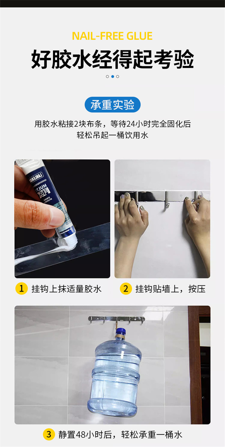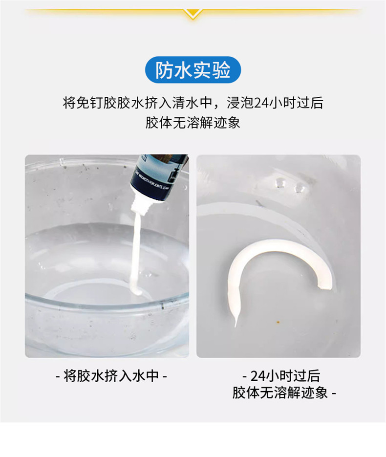 Вместо гвоздей, без повреждения стен, сильная наклеивание, быстрое позиционирование, водонепроницаемость, проникновение, может работать под водой, против плесени, без запаха, без формальдегида, хорошая атмосферостойкость