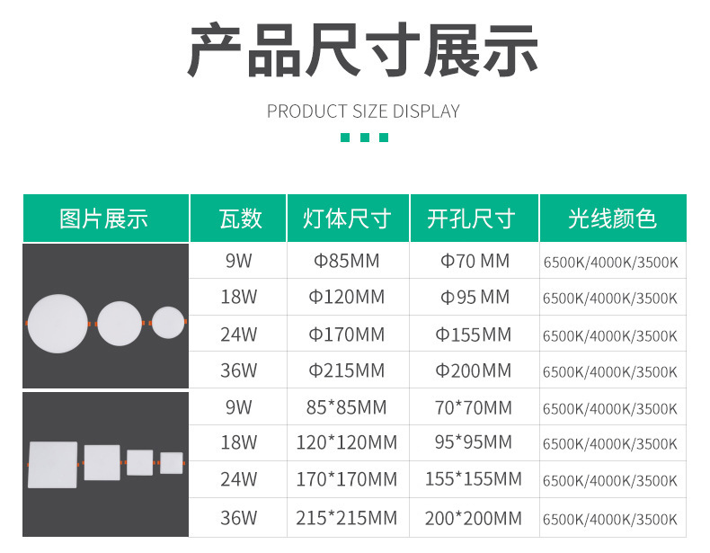 9W круглый; 18 Вт круглый; 24 Вт круглый; 36 Вт круглый; 9 Вт квадрат; 18 Вт квадратный; 24 Вт квадратный; 36 Вт квадратный