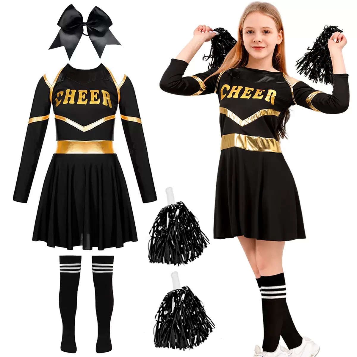 黑色啦啦队蝴蝶结款:链接上是衣服,蝴蝶结两件套,要手花和袜子4件套全套联系客服!