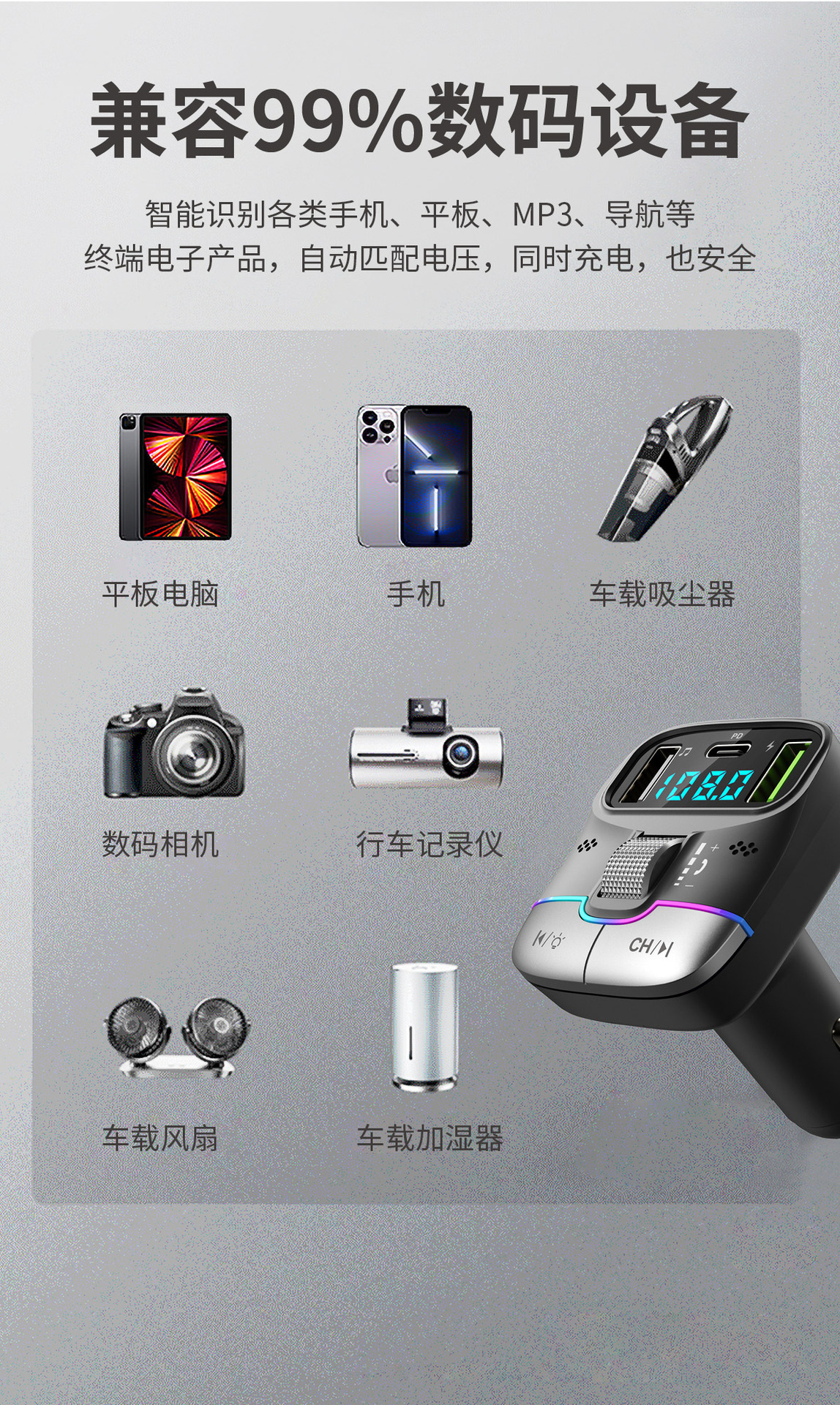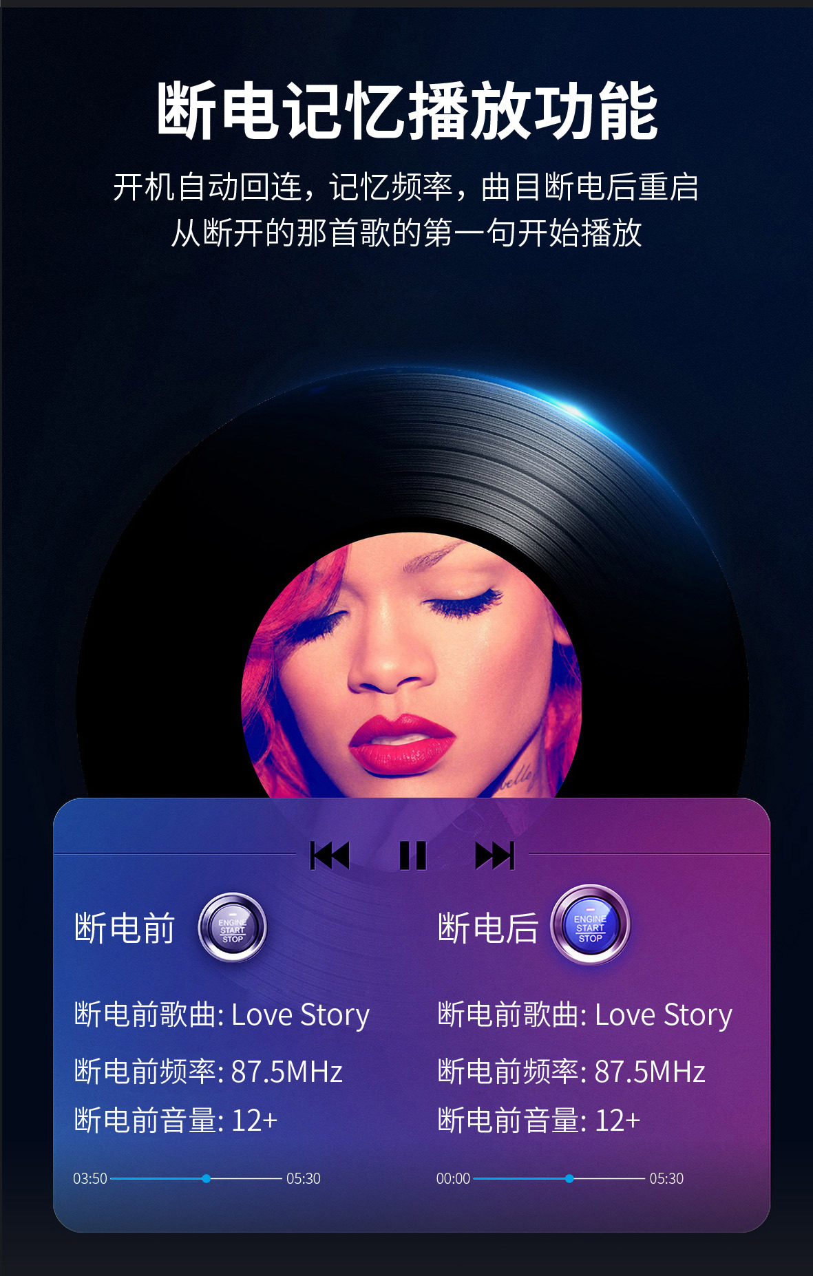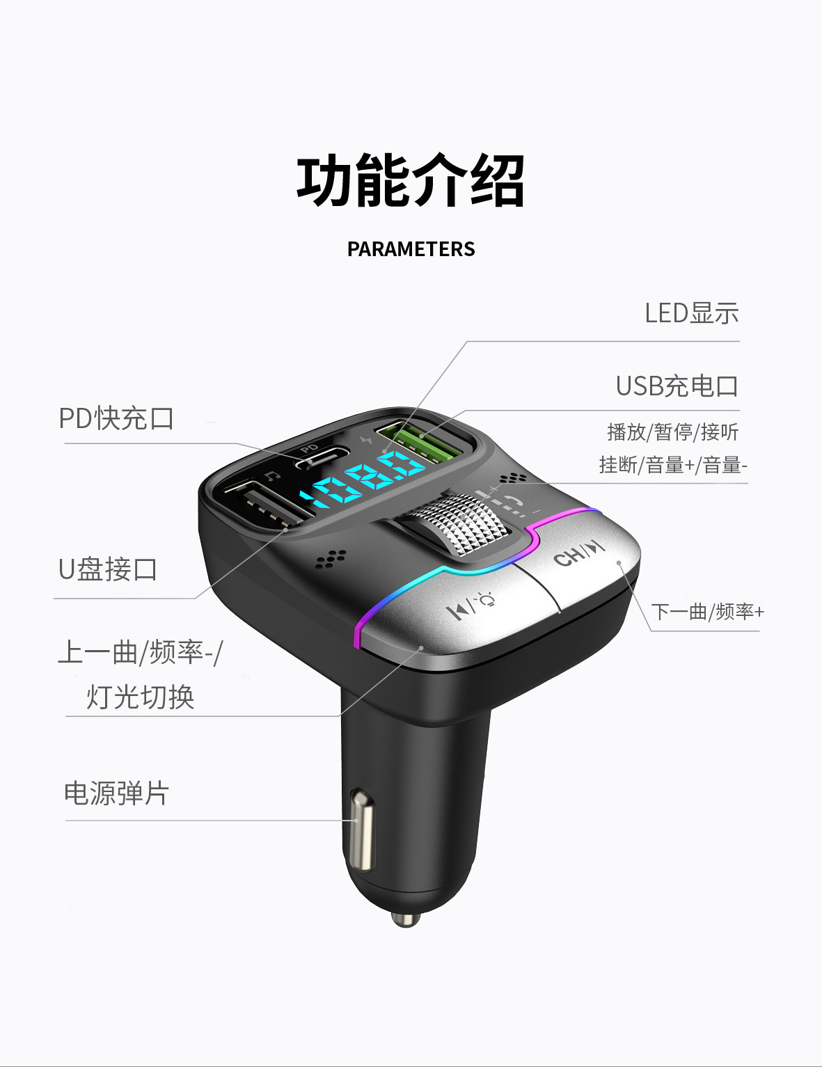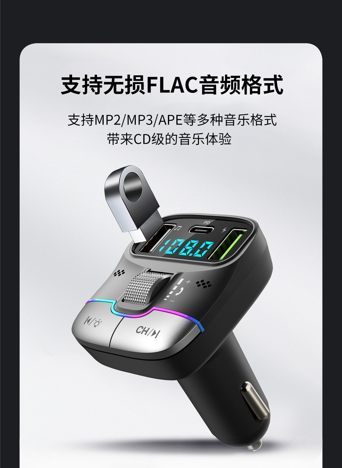 Цветная подсветка, индикатор напряжения, быстрая зарядка, автомобильный MP3-плеер, Bluetooth, USB-флешка, музыкальный плеер, качество звука без потерь