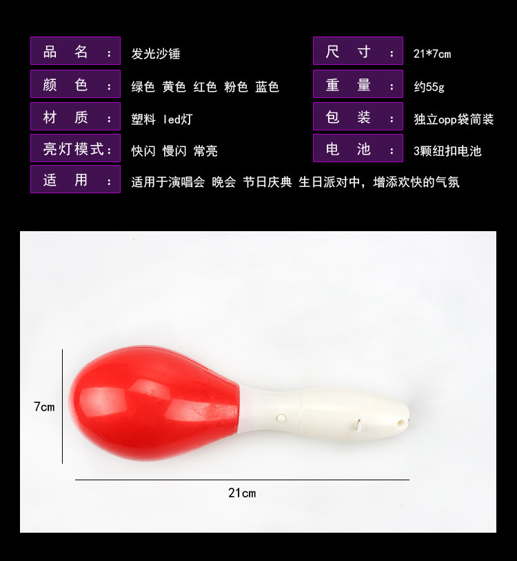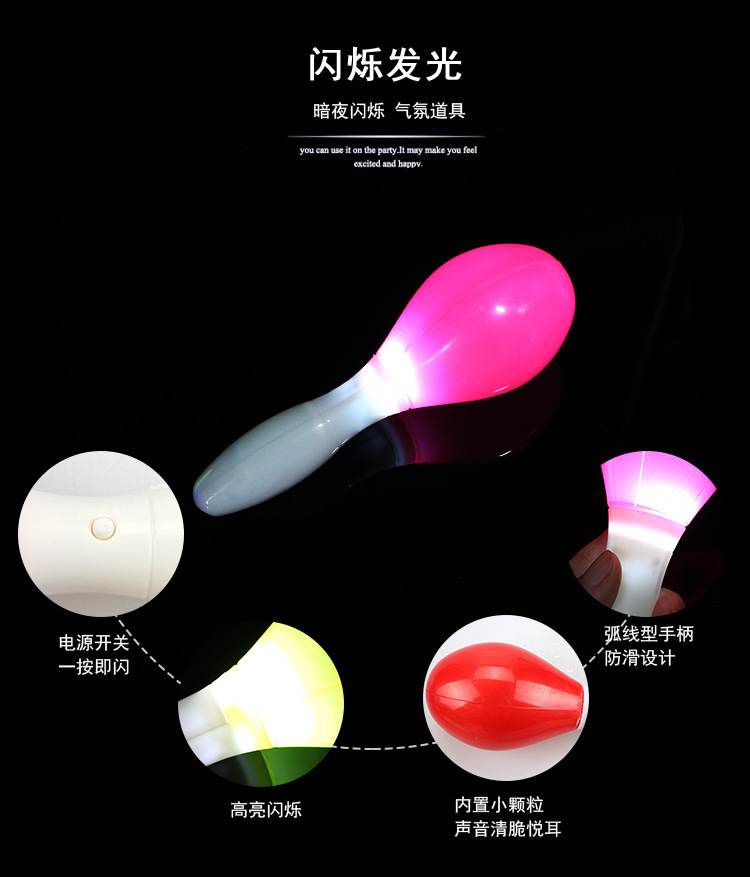 这款LED发光沙锤不仅造型可爱,颜色多彩,还能奏出不同音符,是经常看演唱会、出入各种娱乐场所的潮人的一款助威助兴的小玩具。颜色丰富,量大也可以根据客户的要求订做颜色。也可以印刷LOGO,是广告促销,宣传不可多得的一款创意小礼品。