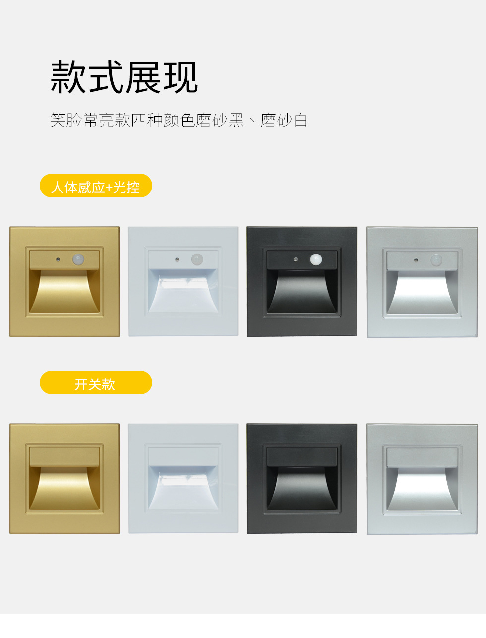 86 черная индукция человеческого тела + управление светом; 86 индукция белого человеческого тела + управление освещением; 86 Серебряная индукция человеческого тела + управление освещением; 86 Золотой датчик человеческого тела + контроль света; 86 Черный всегда яркий; 86 Белый всегда яркий; 86 серебро всегда яркое; 86 золото всегда яркое