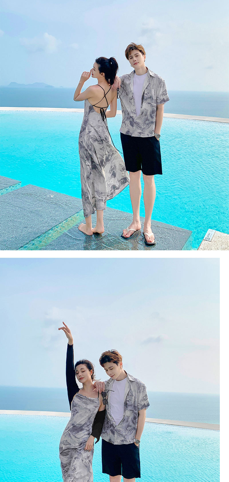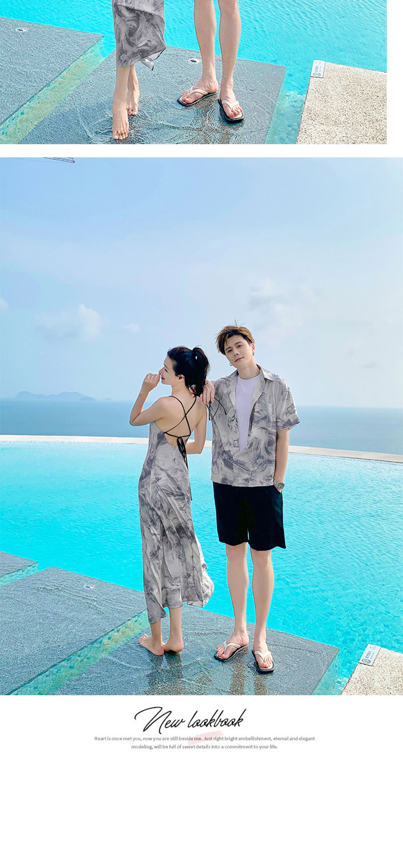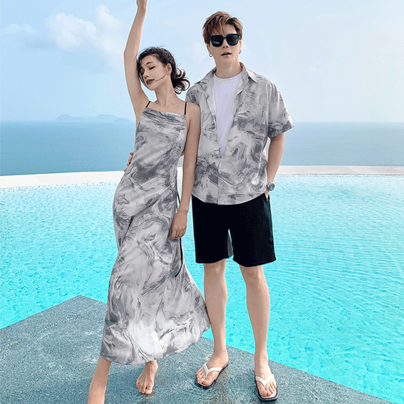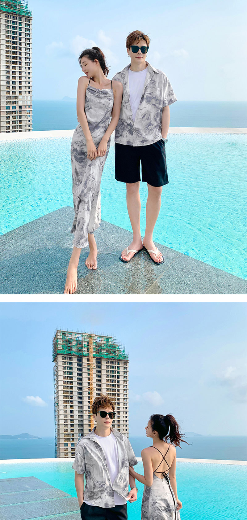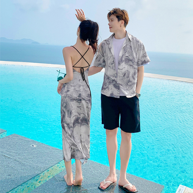 2023 Парное платье Пляжное Приморское дорожное Чернильное платье с открытой спиной и ремешками Мужская рубашка с короткими рукавами