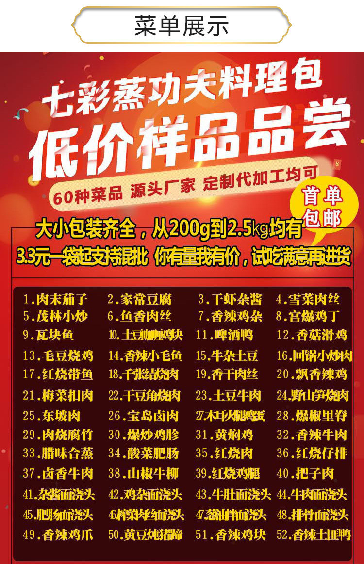 Пробный набор для открытия магазина, 6 упаковок; (Специальное предложение) Ветчина на пару 200г; (Специальное предложение) Свиная отбивная со вкусом 170г; Грибной баклажан 220г; Соус из жареного фарша (мясной соус) 180г; Соус Эдамаме жареный 220г; Свиная тушенка с грибами (свинина) 180г; Куриная смесь Эдамаме 220г; Рыба в соленой marinada, 220 г; Тушеные свиные коптины с соевыми бобами, 250 г; Тушёная свинина с сушёными бобами, 210 г; Говядина с американским черным перцем, 200 г; Одна большая куриная ножка; Одна тушеная утиная ножка в стиле терияки; 100 г свиной жира; Свинина жареная с жареным тофу, 200 г; Бразильское барбекю 200г; Красочные зерна 180г; Слойка свинья с огурцами в маринаде, 180 г; Лапки утки тушеные соевыми соусами, 200 г; Острая свинячая печень с перцем, 180 г; Домашний тофу 220г; Обжаренный соус из сушеных креветок 210г; Грибная ветчина и яйца 180г; Яйца в соусе томатов 220г; 200 г фарша и маринованных бобов; Фармахусская страва 210г; Мясо свинины с рыбным вкусом, измельченное, 220 г; Соус к жареной курице 210г; Закисленная фасоль и куриные грибочки 200г; Острая шинкованная свинина 210г; Курица Кунг Пао 220г; Курица Эдамаме Динг 210г; Пикантная курица, ассорти, 200 г; Куриные наггетсы с картофельным карри, 220 г; Лебедь дикая перцовая разные 210г; Гриб шиитаке и курица 220г; Курица на гриле с эдамаме, 210 г; Курка с острой приправой, 200 г; Жареные куриные сердца 170г; Тушеная курица 220г; Пивная утка 200г; Куриные наггетсы с вкусом кока-колы, 200 г; Рыба плиточная 200г; Куриные полоски с черным перцем, 200 г; Сладко-кислая свинина 220г; Тысячелистая жареная свинина 220г; Острый говяжий барашек 200г; Мясо в сметане 210г; Треска тушеная 200г; Острое говядино 210г; Тушёная свинина с маринованными овощами, 210 г; Свиное баранчье мясо с пикантным перцем, 200 г; Запеченная свинина с луковыми побегами диких горных бамбуков, 210 г; Картофель с говядиной 220 г; Утка тушеная и ребрышки 200г; Солёная рыба и свинина 200 г; Классический говядина, обжаренная на сковороде, 200 г; Тушёная свинина 200г; Телятина с прованским перцем, 180 г; Квашеная капуста и жирная колбаса 210г; Говядина тушеная 180г; Горячие и кислые кусочки ламинарии (холодные) 200г; Грибы горячие и кислые (холодные) 150г; Острая жареная кожа тофу (холодная) 160 г; Шелк «Красное масло» (холодный) 150 г; Соус в глиняной кастрюле 500 г; Красное масло 500г; Кордицепс и куриный суп 360 г; Суп из ребрышек и кукурузы 360г; Топпинг для лапши с жирной кишкой 250г; Топпинг для лапши с говядиной, 250 г; Топпинг для лапши с ребрышками, 250 г; Курица в майонезе, 250 г; Дишаньсянь (новый продукт); Огурцы в соленой marinade от бабушки (Новинка) 160 г; Паста из красной фасоли с османтусом (новинка) 400 г; L Восемь драгоценностей в кашике (Новинка) 400 г; Л Сохранённые яйца и каша из нежирного мяса (Новый продукт) 400 г; Л супоршечка из сырой вареной говядины (новинка) 400г; (Специальное предложение) Бифштекс с ароматом говядины 180г; Яловая говядина ароматная 170г; (Новинка) Сладко-кислые свиные ребрышки 200г; (Новый продукт) Начинка для лапши Чжаян 180 г